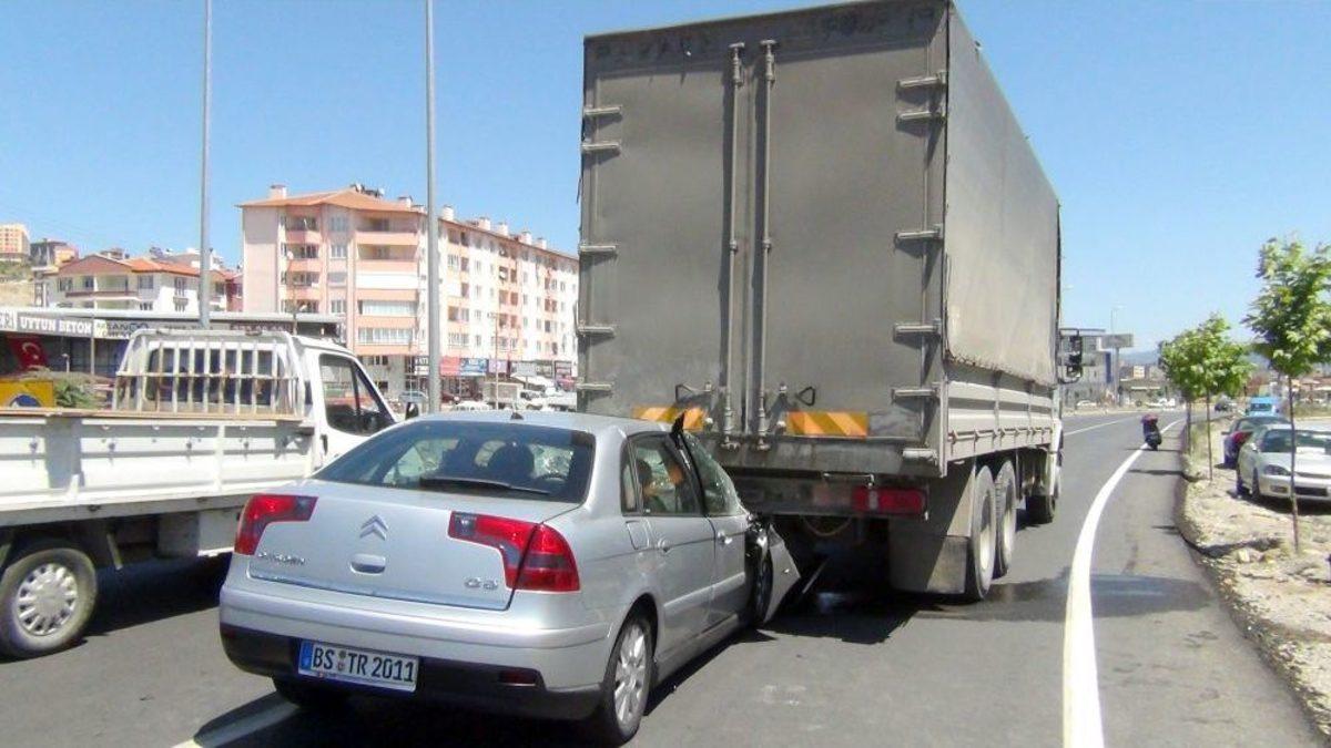 Kaza, Balıkesir’in Edremit ilçesi Zeytindalı Kavşağı, Bölge Trafik karşısında meydana geldi. Almanya'dan tatil için gelen yorgunluktan direksiyon başında uyuklayan Rıfat A., BS TR 2011 plakalı otomobiliyle önünde giden Nadir M. idaresindeki 10 EU 376 plakalı, bir lojistik firmasına ait TIR'a büyük bir hızla çarptı. Çarpmanın etkisiyle otomobilin ön kısmı TIR’ın altına girdi. Kazada ölen ya da yaralanan olmazken otomobilde maddi hasar oluştu. Çarpmanın şiddetiyle TIR’ın altına sıkışan otomobil, bir süre sürüklendi. TIR şoförü Nadir M. "Bir baktım, ağabey arkama takılmış geliyor. Sonradan farkettim, uyumuş kalmış." diye konuştu. Otomobil sürücüsü Rıfat A. da, "Uykusuzdum. Almanya’dan geliyordum." dedi. Kazadan sonra araçlar kurtarıcı yardımıyla götürüldü. Olayla ilgili soruşturma devam ediyor.