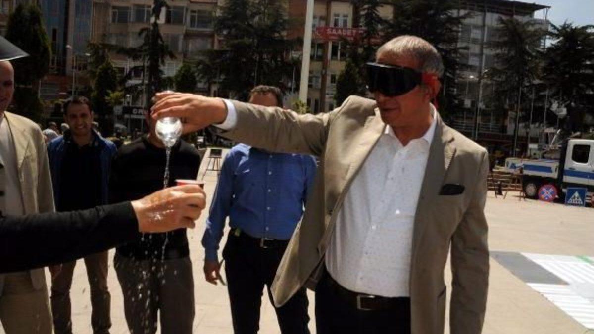 -TOKAT'ta Trafik Haftası nedeniyle düzenlenen programda Emniyet Müdürü Göksel Topaloğlu ve Jandarma Komutanı Albay Hidayet Arıkan alkol gözlüğü takarak, pet şişeden bardağa su doldurmaya çalıştı.