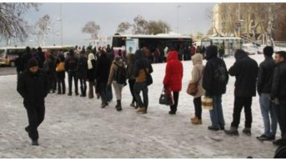 İstanbul'da kar yağışı nedeniyle vatandaşlar toplu taşıma araçlarını tercih etti. Metrobüs ve otobüs duraklarında yaşanan yoğunluk nedeniyle zaman zaman sinirler de gerildi.Şehri etkisi altına alan kar yağışı nedeniyle yetkililerin uyarılarını dikkate alan İstanbullular, toplu taşıma araçlarını tercih etti. Kar yağışı nedeniyle deniz ulaşımında zaman zaman aksaklıklar da yaşandı. Üsküdar'da bulunan iskeleye gelen vatandaşlar, motor seferlerinin iptal olduğunu gördü. Şehir hatları vapurlarına yönelen vatandaşlar, yoğunluğa neden oldu.Beşiktaş meydanında ise uzun otobüs kuyrukları oluştu. 100 metreyi bulan otobüs kuyruklarında bekleyen vatandaşlar, "Her zaman biraz kuyruk oluyordu ama bugün kar yağdığı için kuyruk daha da uzadı. Burası İstanbul, normal" dedi. Otobüs kuyruğunda zaman zaman sinirler de gerildi. Bir kadın sıraya girmeden otobüse binmeye çalışan bir kişiye, "Biz burada sırada bekliyoruz, sen niye sıraya girmiyorsun" diyerek tepki gösterdi.