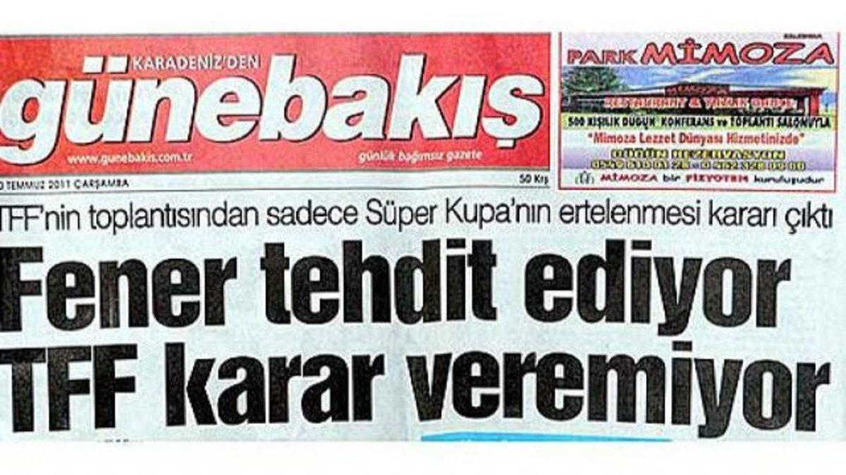 "FENER TEHDİT EDİYOR, TFF KARAR VEREMİYOR" Günebakış Gazetesi de, "TFF'nin toplantısından Süper Kupa'nın ertelenmesi kararı çıktı" ve "Fener tehdit ediyor, TFF karar veremiyor" başlıklarını kullandı. Gazete, "Hapisten tehdit ediyor" başlığının içerisinde de, "Türkiye Futbol Federasyonu daha önce Fenerbahçe'yi mutlu edecek şekilde aldığı kararlarından asla vazgeçmiyor. Başkanı, asbaşkanı, saymanı ve ulakları halen tutuklu olan Fenerbahçe, topluma masummuş gibi sunulmak isteniyor" diyerek Futbol Federasyonu'nu çok ağır bir şekilde eleştirdi.