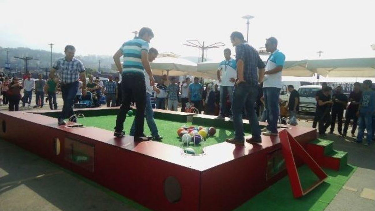 Futbolla bilardo kurallarını birleştiren Ayak Bilardosu (Foot Snooker) ile tanışan Trabzonlular, Forum Trabzon Alışveriş Merkezi’nde düzenlenen turnuvaya büyük ilgi gösterdi. Dünyanın en küçük futbol sahasında dünyanın en büyük bilardosunu oynama fırsatı bulan Forum Trabzon ziyaretçileri, bu kez bilardo sopası yerine ayaklarıyla atış yaparak topları futbol kalesine değil, bilardo masasının deliklerine isabet ettirmeye çalıştılar. Ayak Bilardosu’nu oynayanlar kadar izleyenlerin de eğlendiği etkinlikle Forum Trabzon ziyaretçileri, eğlencenin keyfini çıkardılar.