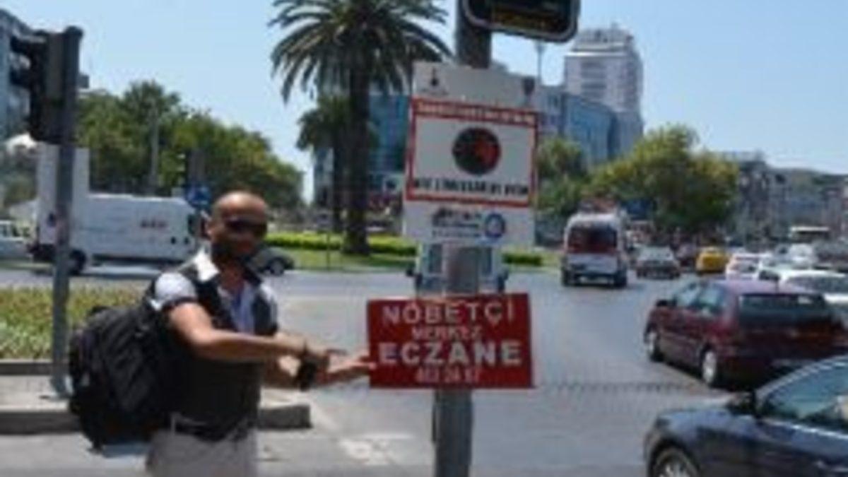 Konak ilçesi Basmane semtindeki bir trafik lambası direğine asılı olan 'Nöbetçi Eczane' tabelası, araç sürücüleri ve yoldan geçenleri şaşırttı. Öte yandan, eczane sahibi, tabelayı trafik lambasına asma nedenini gece vatandaşlara yardımcı olmak olarak açıkladı.