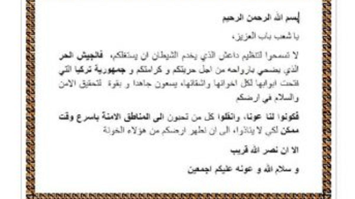 "Bismillahirrahmanirrahim. Değerli El Bab halkı, şeytana hizmet eden DEAŞ terör örgütünün sizleri kullanmasına izin vermeyin. Sizlerin özgürlük ve felahı için hayatını ortaya koyan Özgür Suriye Ordusu ve kardeşlerine her zaman kapısını açan Türkiye Cumhuriyeti, topraklarınıza huzuru ve güveni getirmek için tüm gücüyle çaba sarf etmektedir. Bize yardımcı olun ve bizler topraklarınızı bu hainlerden temizleyene kadar zarar görmemeleri için sevdiklerinizi en kısa sürede güvenli bölgelere taşıyın. Zafer Allah’ın izni ile yakındır. Allah’ın selamı ve desteği üzerinize olsun."
