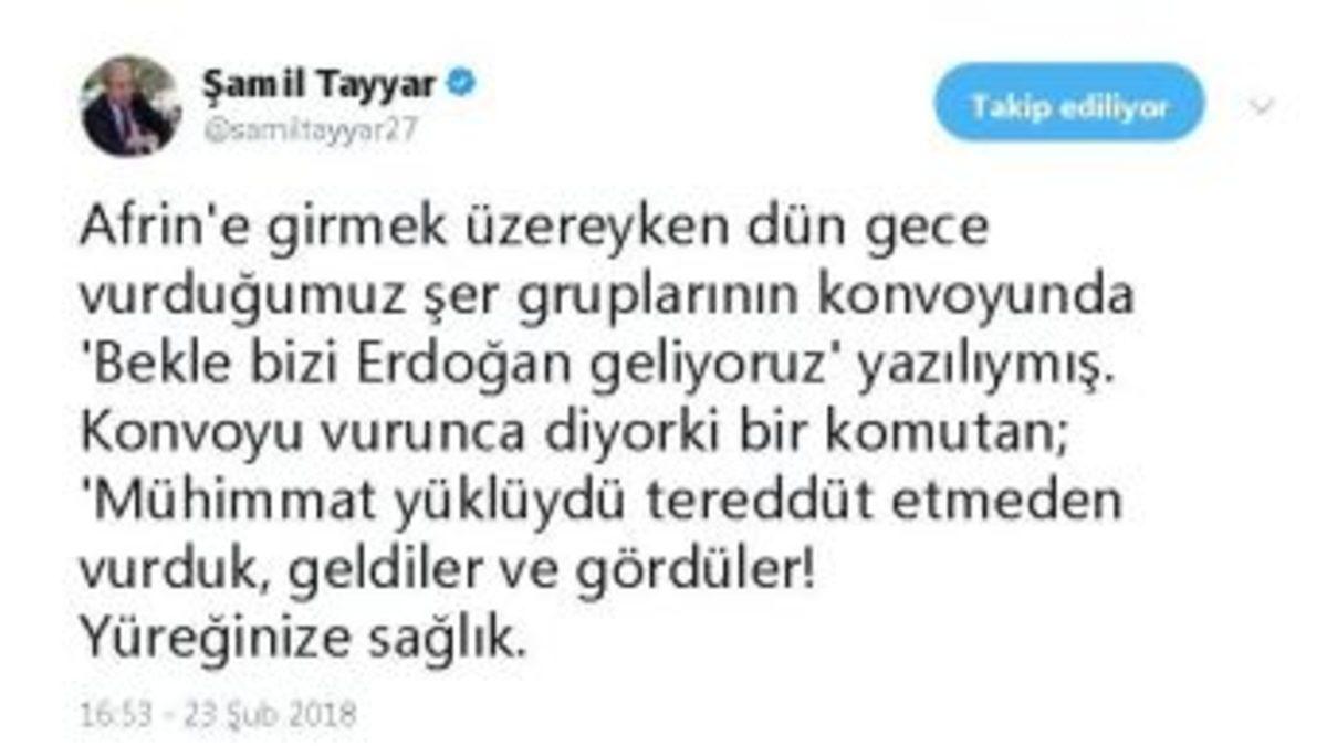 AK Parti Gaziantep Milletvekili Şamil Tayyar, Türk Silahlı Kuvvetleri tarafından Afrin’de mühimmat yüklü terör konvoyunun vurulması ile ilgili ilginç bir detay açıkladı.Milletvekili Şamil Tayyar, sosyal medya hesabından yaptığı açıklamada, Afrin’de dün vurulan mühimmat yüklü terör konvoyunda, "Bekle bizi Erdoğan" yazılı olduğunu belirtti. Konvoyu vuran komutanın o andaki duygularını ifade eden sözleri de aktaran Tayyar, "Konvoyu vurunca diyor ki bir komutan; ’mühimmat yüklüydü tereddüt etmeden vurduk, geldiler ve gördüler’" ifadelerine yer verdi.Tayyar, terör konvoyunu vuran askerler için ise "Yüreğinize sağlık" ifadelerini kullandı.