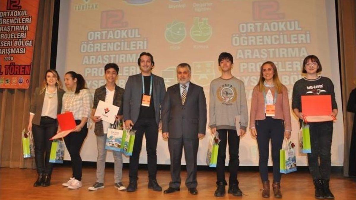 Erciyes Üniversitesi’nin ev sahipliğinde düzenlenen TÜBİTAK 12. Ortaokul Öğrencileri Araştırma Projeleri Kayseri Bölge Yarışmasında dereceye girenler ödüllendirildi.Düzenlenen ödül törenine; Rektör Prof. Dr. Muhammet Güven, İl Milli Eğitim Müdür Vekili Sezai Çamdalı, TÜBİTAK Kayseri Bölge Koordinatörü Prof. Dr. Sebahattin Ünalan’ın yanı sıra çok sayıda akademisyen, öğretmen ve öğrenci katıldı.Ödül töreninin açılış konuşmasını yapan TÜBİTAK Kayseri Bölge Koordinatörü Prof. Dr. Sebahattin Ünalan, yarışma hakkında bilgiler verdi.Prof. Dr. Ünalan, “TÜBİTAK tarafından düzenlenen 8 farklı alanda 3 aşamadan oluşan bir yarışmadır. Türkiye genelinde 2017 yılında 7 bin 905 başvuru yapılırken, bu yıl başvuru sayımız 11 bin 352 olmuştur. Bugün 8 farklı alanda 29 projeye ödül almakta olup, 13 projemiz ise ilimizde yapılacak Türkiye finallerinde bölgemizi temsil edecektir” dedi.İl Milli Eğitim Müdür Vekili Sezai Çamdalı da konuşmasında, dereceye giren öğrencileri tebrik etti.Çamdalı, “Bir fikri olan, bir projesi olan her zaman bizim için değerlidir. Burada her öğrenci yarışmanın amacına ulaşmasına vesile olmuştur. Bu yarışmaların temel amacı öğrencilerimiz erken yaşta bilimsel düşünceye yönlendirmektir.” diye konuştu.Rektör Prof. Dr. Muhammet Güven ise konuşmasında, sergide özgün projelerin yer aldığını belirterek, tüm öğrencilere başarılar diledi.Rektör Güven, “Burada çok sayıda bilim insanı adayı genç arkadaşımız var. İnşallah öyle olacaklarına da inancımız tam. Gelecek bu genç arkadaşlarımızın omuzlarında yükselecek. Büyük Türkiye hayalimizi gençlerimiz gerçekleştirecektir. Bundan sonraki hayatlarınızda araştırma, proje yapma heveslerinizi kaybetmemenizi diliyorum. Bunun içinde öğretmenlerimize büyük iş düşüyor. Daha fazla projeyle, daha fazla öğrencinin ilgisini çekmek gerekiyor. Çünkü Türkiye 80 milyona yakın nüfusu ile büyük bir ülke ve giderek de büyümektedir. O yüzden daha fazla bilim insanına, daha fazla projeye ve araştırmaya ihtiyacımız var. Bu anlamda öğrencilerimiz ve öğretmenlerimize büyük görev düşmektedir” şeklinde konuştu.Konuşmaların ardından dereceye giren ortaokul öğrencilerine ödülleri takdim edildi.1. BİYOLOJİ KAYSERİ ATATÜRK ORTAOKULU2. BİYOLOJİ KAYSERİ ÇETİN ŞEN BİLİM VE SANAT MERKEZİ3. DEĞERLER EĞİTİMİ KAYSERİ ÇETİN ŞEN BİLİM VE SANAT MERKEZİ1. KİMYA KAYSERİ ÇETİN ŞEN BİLİM VE SANAT MERKEZİ1. KİMYA KAYSERİ ÇETİN ŞEN BİLİM VE SANAT MERKEZİ3. KİMYA KAYSERİ ÇETİN ŞEN BİLİM VE SANAT MERKEZİ1. KODLAMA KAYSERİ ÇETİN ŞEN BİLİM VE SANAT MERKEZİ3. KODLAMA KAYSERİ ÇETİN ŞEN BİLİM VE SANAT MERKEZİ2. MATEMATİK KAYSERİ ÇETİN ŞEN BİLİM VE SANAT MERKEZİ1. MATEMATİK KAYSERİ ÇETİN ŞEN BİLİM VE SANAT MERKEZİ3. MATEMATİK KAYSERİ ÇETİN ŞEN BİLİM VE SANAT MERKEZİ1. MATEMATİK KAYSERİ MÜNCÜBE CINGILLIOĞLU ORTAOKULU2. TÜRKÇE KAYSERİ 75.YIL MÜHİBE GERMİRLİ ORTAOKULU3. TÜRKÇE KAYSERİ ÇETİN ŞEN BİLİM VE SANAT MERKEZİ