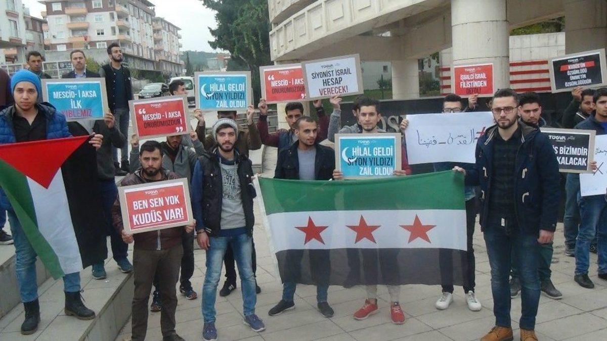 TÜGVA Osmaniye Temsilciği, ABD Başkanı Trump’ın Kudüs’ü İsrail’in başkenti olarak tanıyacağı açıklamasına tepki gösterdi.Osmaniye Korkutata Üniversitesi kapısında açıklama yapan TÜGVA Osmaniye Şube Başkanı Talha Akif Gürbüz, her geçen gün İslam coğrafyasının küresel sömürü düzeninin kıskacında kan gölüne çevrildiğini söyledi.İsrail’in daha önce İslam’ın ilk kıblesi olan Kudüs’te ezanı yasakladığını, son olarak işgalci siyonistlerin başkenti olarak ilan edilmesi cüretinde bulunulduğunu ifade eden Gürbüz, “Bir eşkıya ordusuna karşı dik duruşun bir Müslüman için namus meselesi olduğunu tüm İslam alemine hatırlatıyoruz. İslam alemini reel politik kaygılardan arınarak, Amerika’dan, İsrail’den değil Allah’tan korkmaya ve O’na teslim olmaya çağırıyoruz. Artık ümmetin prangalarından kurtulması ile Filistin’in özgürlüğüne kavuşması aynı çizgiye gelmiştir” dedi.Gürbüz, açıklamasında şunları kaydetti:"Tarih bize göstermiştir ki; Theodor Herzl’ın rüyasıyla hareket edenler, bu çağın Selahattinlerini, Abdülhamidlerini hesaba katmazlarsa acı bir kabusa uyanacaklardır. Şimdi, İslam coğrafyası üzerinde yeni üretilen silahların tatbikatının yapılmasına göz yuman, kimseye hesap verme gereği duymadan çocukları öldürülen, kadınlarının namuslarına tecavüz edilen, ilk kıblesine el uzatılan İslam dünyasının mensuplarına sesleniyoruz. Daha neyi bekliyorsunuz? Daha ne kadar kendi kardeşlerinize, ümmetin meselelerine sağır, dilsiz kalacak; görmezden geleceksiniz? Filistin dar bir coğrafyada bulunan bir takım insanların meselesi değil tüm İslam aleminin namusudur. Celladından diz çöküp af dileme gafletinden kurtulunuz. Dünya var oldukça yeryüzü bizimdir, Kudüs bizimdir.”