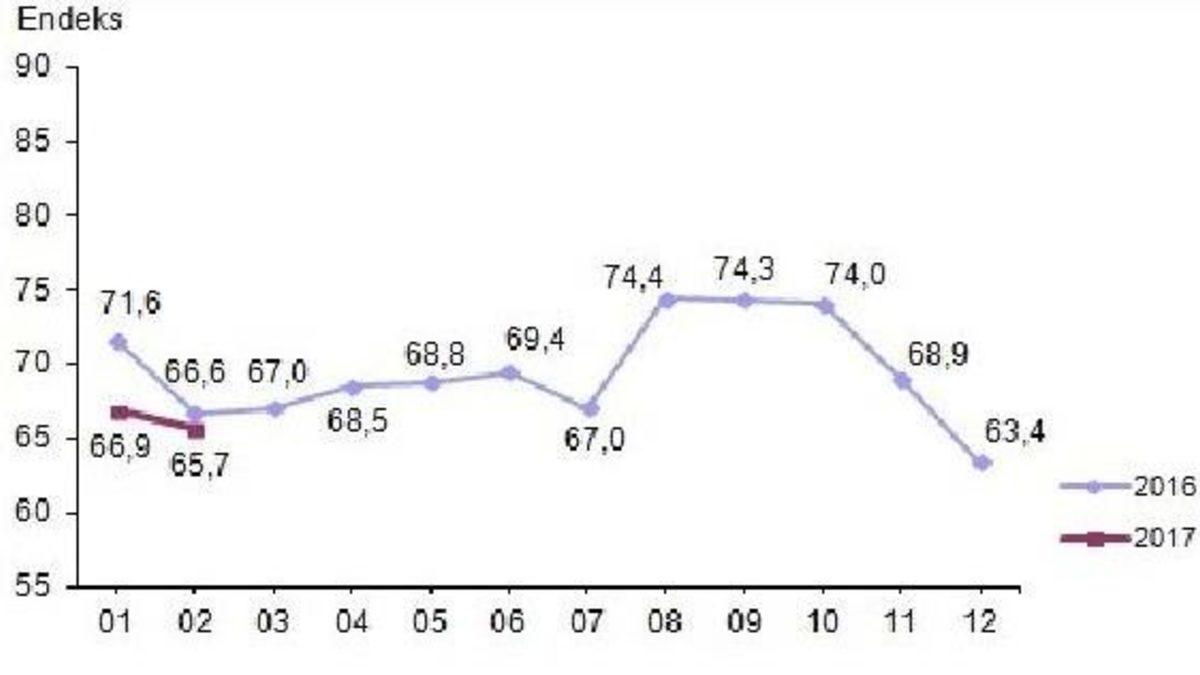Türkiye İstatistik Kurumu ve Türkiye Cumhuriyet Merkez Bankası işbirliği ile yürütülen tüketici eğilim anketi sonuçlarından hesaplanan tüketici güven endeksi, Şubat ayında bir önceki aya göre yüzde 1.8 azalışla, Ocak ayındaki 66.9 düzeyinden Şubat'ta 65.7'ye indi.