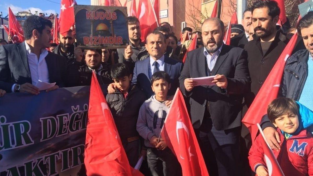 ABD Başkanı Donald Trump’ın, Kudüs’ü İsrail’in başkenti olarak tanıma kararı Tunceli’de protesto edildi.Cuma namazı çıkışı Atatürk Mahallesi’ndeki Yunus Emre Camii önünde bir araya gelen grup ellerinde “Kudüs bizimdir”, “Tunceli Kudüs’e sahip çıkıyor”, “Kudüs kırmızıçizgimizdir” yazılı dövizlerle Trump’a tepki gösterdi.Grup adına açıklamada bulunan AK Parti Tunceli İl Başkanı Fatih Tek, ABD Başkanı Trump’ın Kudüs açıklamasının, insanlık vicdanını yaralayarak bölgedeki sorunları derinleştirdiğini söyledi.Kudüs’ün tüm Müslümanların kırmızı çizgisi olduğunu belirten Tek, “Bu, bölgemizde barışı ve istikrarı tehdit etmeye yönelik bir adımdır. Alınan kararın, İsrail ve Filistin toplumları arasındaki husumeti arttırmaktan başka sonucu olmayacaktır. Asla kabul edilemez gördüğümüz bu karardan en kısa sürede dönülmelidir. İslam’ın sesini susturmak, kendi kurguları olan terör örgütlerini bahane ederek Müslümanların iradelerini esir etmek isteyenler, tarihte defalarca olduğu gibi yine hüsrana uğrayacaklardır” dedi.Açıklamaya, Vali ve Belediye Başkan Vekili Tuncay Sonel, partililer, STK temsilcileri ve çok sayıda vatandaş katıldı.