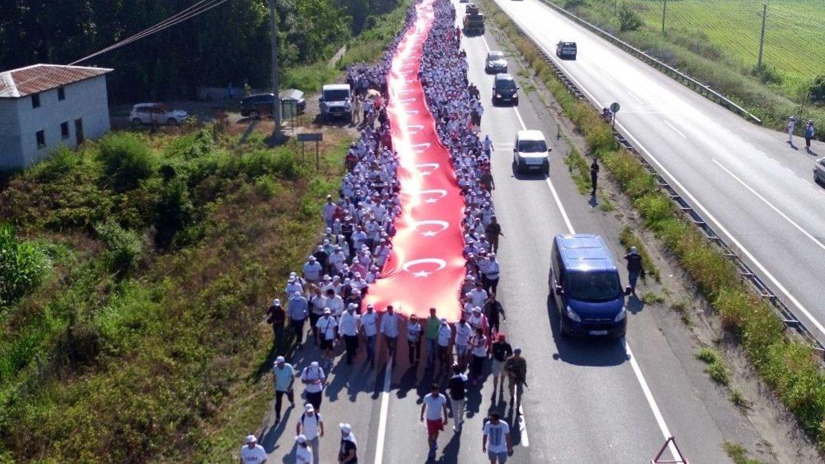 CHP Genel Başkanı Kemal Kılıçdaroğlu tarafından başlatılan Adalet Yürüyüşü’nün 17’nci gününde katılımcılar Beşiktaş Belediyesi tarafından getirilen bin 1 metrelik Türk bayrağını taşıyarak yürüdü. Renkli görüntülerin oluştuğu Türk bayraklı kortej havadan görüntülendi.Adalet Yürüyüşü’nün 17’nci günü yoğun bir katılımla gerçekleşti. Beşiktaş Belediyesi tarafından yürüyüş için getirilen bin 1 metrelik Türk bayrağı açıldı. yaklaşık 7 kilometreyi bulan kortej Türk bayrağı altında yürüyüşe devam etti.Akyazı’dan Sakarya merkeze kadar uzanan Türk bayrağı yol boyunca muhteşem görüntülere sahne odu. Yol boyuncu uzanan bayrağı on binlerce kişi, sıcak havaya rağmen omuzlarında taşıdı.Yürüyüşe Beşiktaş Belediye Başkanı Murat Hazinedar da katılırken, Türk bayrağı altında gerçekleştirilen yürüyüş havadan görüntülendi.