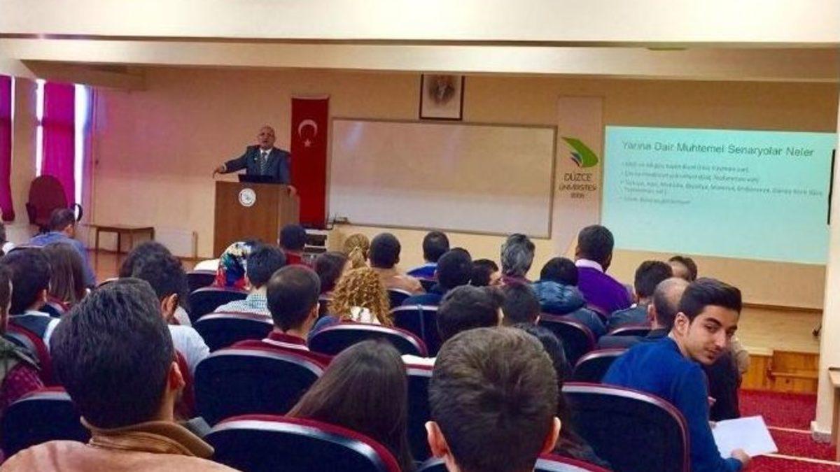 Akçakoca Turizm İşletmeciliği ve Otelcilik Yüksekokulu Müdürü ve Uluslararası İlişkiler Bölüm Başkanı Doç. Dr. Zafer Akbaş konuşmasında Türkiye’den, konumu ve özellikleri itibariyle birçok ülkenin rahatsız olduğundan söz etti.Düzce Üniversitesi Akçakoca Turizm İşletmeciliği ve Otelcilik Yüksekokulu tarafından “Dünden Yarına Jeopolitik Merkez Olarak Türkiye ve Büyük Oyun: Aktörler, Eylemler, Süreçler” başlıklı bir konferans düzenlendi.Yüksekokul Müdürü ve Uluslararası İlişkiler Bölüm Başkanı Doç. Dr. Zafer Akbaş tarafından Akçakoca Yerleşkesi Konferans Salonu’nda gerçekleştirilen konferansa; akademik ve idari personel ile öğrenciler katıldı.Dünya tarihi ve ileri sürülen teoriler ile ilgili ayrıntılı bilgi vererek konuşmasına başlayan Doç. Dr. Zafer Akbaş, Türkiye’nin dini kimliği, coğrafi konumu, dünden bugüne getirdikleri ve jeopolitik konumuyla dünyada oynanan ya da oynanması planlanan birçok senaryonun tam ortasında olduğunu ifade etti.“Ülkemiz merkez ülke”Jeopolitikanın günümüzde öneminin yeniden arttığını söyleyen Doç. Dr. Akbaş, bu bağlamda Türkiye’nin önemli bir aktör haline dönüştüğünü ve uluslararası politikada daha etkili olduğunu belirterek Ülkemizin merkez ülkelerden biri haline geldiğinin altını çizdi.Konuşmasında İngiliz bilim adamı John Mackinder’in “Kara Hakimiyet” teorisine değinen ve konuyla ilgili dikkat çekici bilgiler paylaşan Doç. Dr. Zafer Akbaş bu teoride, ülkelerin de hücreler gibi kendilerine meşruiyet kazandırma adına çevresindeki varlıkları tüketerek hayatta kalabileceklerinin belirtildiğini sözlerine ekledi. Akbaş, teoriye göre devletlerin varlıklarının devamını sağlayabilmesi için çevresindeki ya da etki alanındaki ülkeleri kendi menfaatleri doğrultusunda işgal etme düşüncesine sahip olabileceğini, yönetmek veya onları etkisiz hale getirmek isteyebileceğini dile getirdi.“Türkiye’den rahatsızlar”Günümüzde yaşanan birçok olayın bu eksende cereyan ettiğini söyleyen Doç. Dr. Zafer Akbaş, küresel güçlerin çıkarları doğrultusunda kendi kaynaklarını yönettiğine ve kendilerine ait olmayan kaynakların da transfer sürecini yönettiklerine dikkat çekerek bu noktada Türkiye’den, konumu ve özellikleri itibariyle birçok ülkenin rahatsız olduğundan söz etti.Tarihsel, kültürel ve medeniyet gelişimine anavatanlık yapan Türkiye’nin; jeostratejik ve jeoekonomik özellikleri yanında geçmişten günümüze kadar sürdürmüş olduğu Müslüman dünyasının en önemli aktörü olma özelliğinin de büyük güçler tarafından artık kabul edildiğini ifade eden Doç. Dr. Akbaş, birçok ülkenin de dış politikasını bu eksende oluşturmak zorunda olduğunu vurguladı.Uluslararası alanda önemli bir aktör olan Türkiye’nin, etrafında oynanan oyunların farkında olduğuna ve gelişen olaylara bakılınca birçok oyunu bozduğuna dikkat çeken Akbaş, Ülkemizin bundan sonra oynanacak oyunları bozmaya muktedir olduğunu sözlerine ekledi.“Batı artık eski gücüne sahip değil”Batı’nın artık eski gücüne sahip olmadığını ve etkinlik alanının giderek zayıfladığını söyleyen Doç. Dr. Akbaş, dünya medeniyetinin ortaya çıkma yeri olan Mezopotamya’nın, asıl kimliğinin ve özelliğinin farkında olduğuna vurgu yaptı.Milli değerlerimiz, milli şuurumuz, maddi ve manevi kapasitemiz sayesinde hiçbir gücün Ülkemizi zayıflatamayacağını belirten Doç. Dr. Zafer Akbaş, Türkiye’yi daha güzel ve güçlü yarınların beklediğini söyleyerek sunumunu sonlandırdı.Konferans, katılımcılarla toplu fotoğraf çekiminin ardından son buldu.