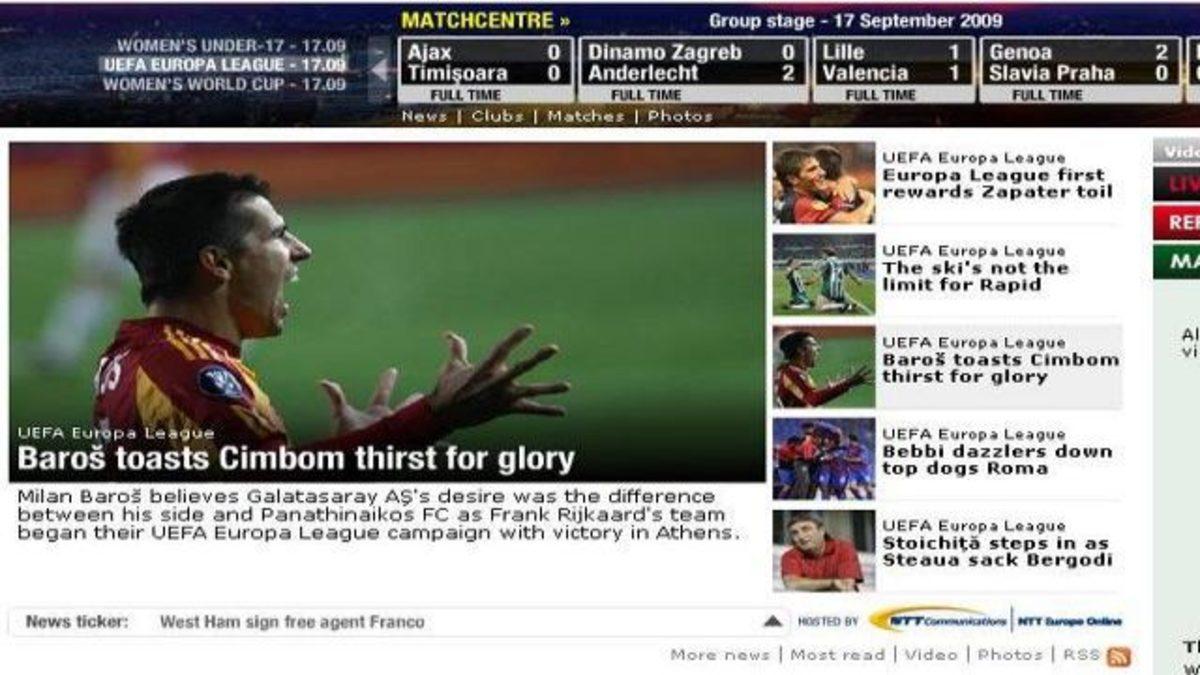 UEFA, Galatasaray"ın dün akşam deplasmanda Panathinaikos"u 3-1 ile geçmesini resmi internet sitesinin ana sayfasından "Baros, Cimbom"u zafere taşıdı" başlığıyla okuyucularına iletti.