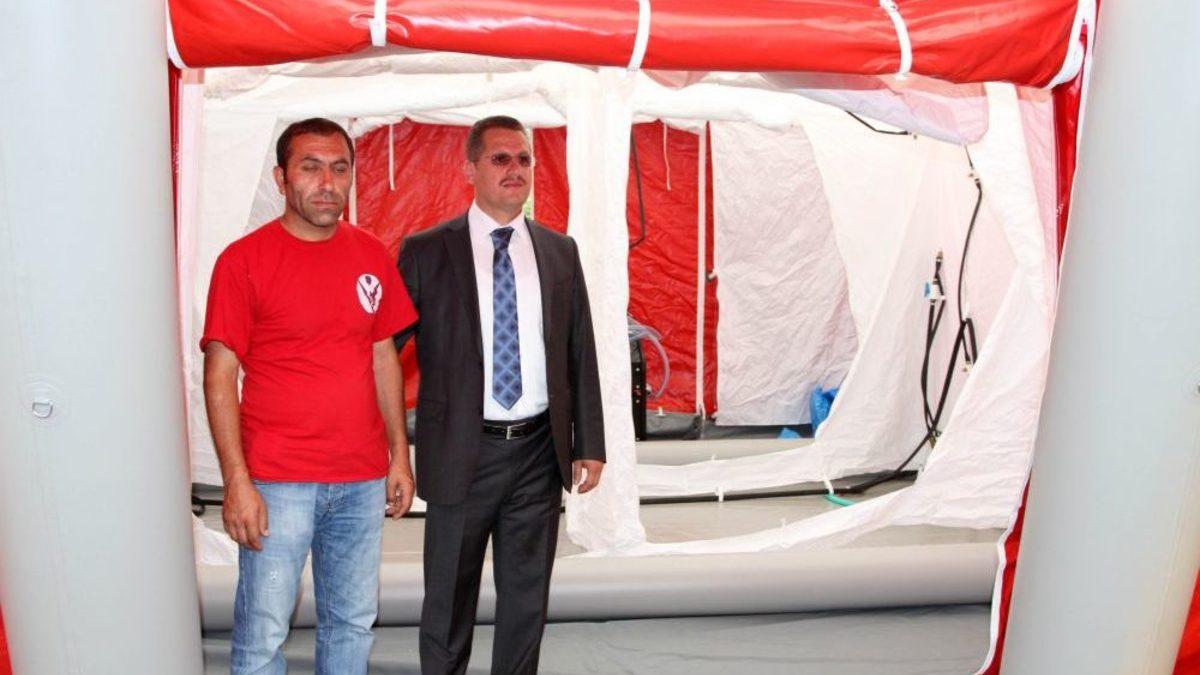 112 Acil Servis bahçesinde, UMKE 65 metre karelik 8 adet mobil hastane çadırı kısa sürüde kuruyor. Mobil hastane içerisinde kimyasal arıtma alanı, laboratuvar, ameliyathane ile 60 hasta kapasiteli yataklar bulunuyor.