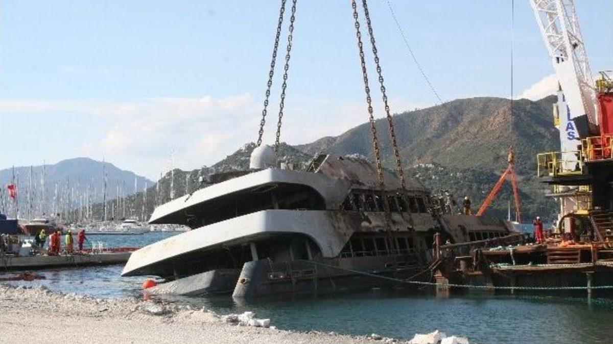 Muğla’nın Marmaris ilçesinde yanarak batan eski Galatasaray Başkanı Ünal Aysal’ın Barbie isimli lüks yatı denizden çıkarıldı.Yalancınoğaz’daki bir marinada batan yat, 5 kişilik dalgıç ekibi tarafından tek parça halinde sudan çıkarıldı. Daha önce 3 parçaya bölünerek çıkarılacağı belirtilen Barbie’nin İzmir Aliağa’ya gönderileceği öğrenildi.Eski Galatasaray Başkanı Ünal Aysal’ın 80 milyonluk lüks yatı Barbie, İtalyan firmasına ait The One isimli yatta çıkan yangının sıçraması sonucu yanarak batmıştı. Ünal Aysal’ın da Barbie’nin yerine başka bir lüks yat siparişi verdiği öğrenildi.