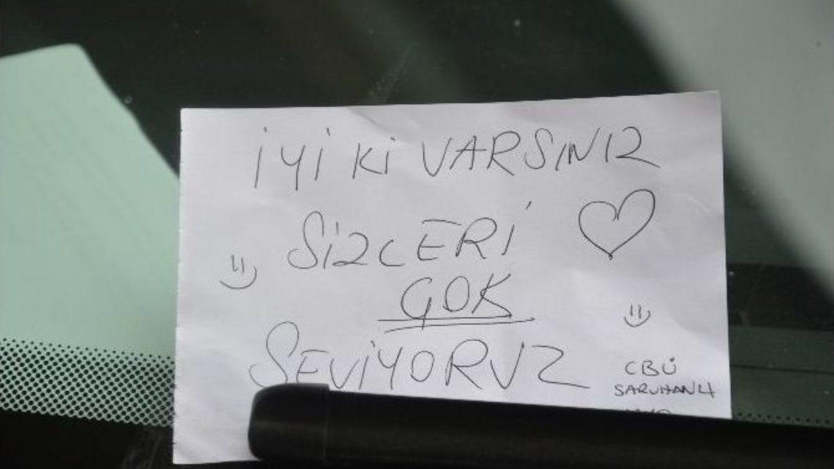 Manisa Celal Bayar Üniversitesi Saruhanlı Meslek Yüksekokulu öğrencileri polisin yanında olduklarını gösteren bir notu ekip aracının üstüne bıraktı.5 Ocak günü İzmir Adliyesinde yaşanan terör saldırısı tüm ülkeyi yasa boğarken Manisa Celal Bayar Üniversitesi Meslek Yüksekokulu öğrencileri polisin yanında olduklarını gösteren bir notu ekip aracının üstüne bıraktı. Bıraktıkları nota, ‘İyi ki varsınız, sizleri çok seviyoruz’ yazan üniversiteliler polisin yanında olduklarını bir kez daha gösterdi. Notu polisler görmeden ekip aracının silgecine bırakan öğrenciler, sabah notu bulan emniyet çalışanlarına büyük mutluluk yaşattı.