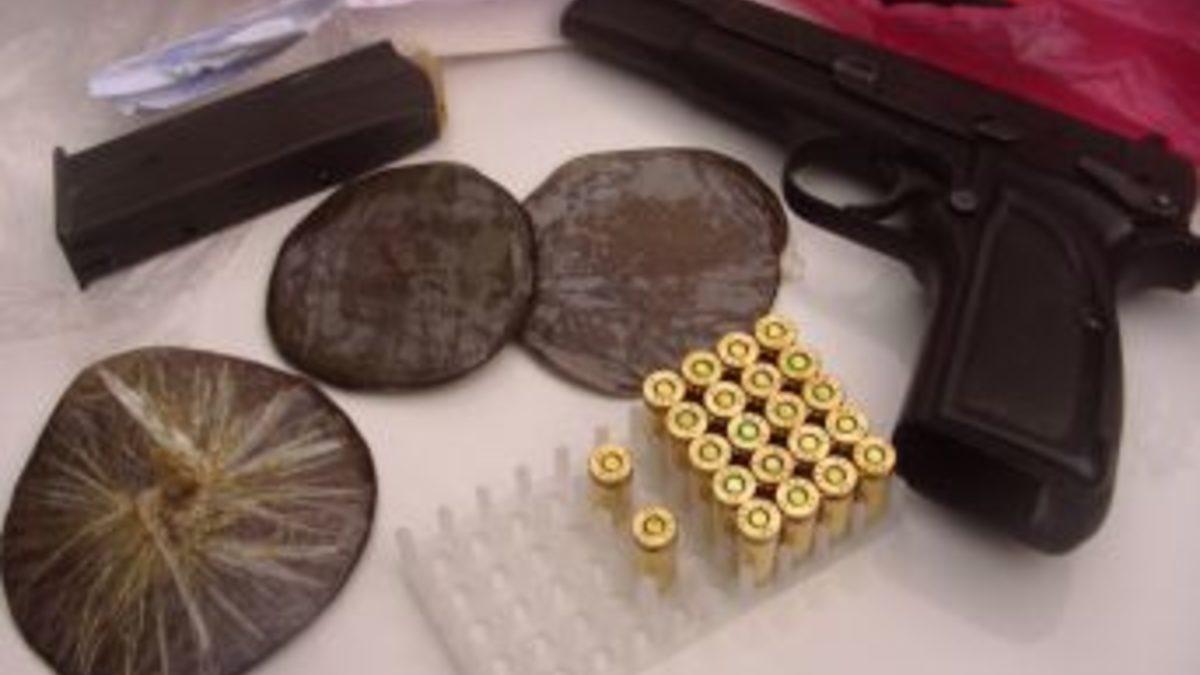 Bir otomobilde yapılan aramada ise beş parça halinde, daralı 107 gr. gelen plaka esrar maddesi, 1 adet 9 mm. çaplı tabanca, tabancaya ait şarjör ve 35 adet 9 mm. çapında fişek ile 1 adet sahte nüfus cüzdanı ele geçirdi. Arabada bulunan dört kişi gözaltına alındı.