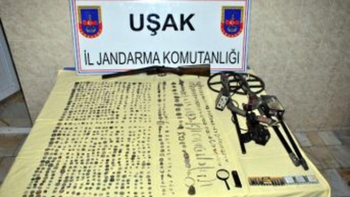 Uşak’ta jandarma ekiplerinin tarihi eser kaçakçılarına yönelik düzenlediği operasyonda çok sayıda tarihi eser niteliği taşıyan obje ele geçirildi.Edinilen bilgiye göre, Uşak İl Jandarma Komutanlığınca alınan ihbar ve yapılan istihbari çalışmalar neticesinde adli makamlardan arama kararı çıkartıldı. Uşak’ta merkeze bağlı bir köyde ikamet eden Z.Ö. isimli şüphelinin evinde yapılan aramada tarihi eser olduğu değerlendirilen 740 adet metal sikke, 120 adet obje, 44 adet metal yüzük, 15 adet metal ok ucu ile 2 adet dedektör, 1 adet ruhsatsız av tüfeği, 1 adet tabanca şarjörü ve 3 adet tabanca fişeği ele geçirildi. Z.Ö. isimli şüpheli Jandarma tarafından gözaltına alındı.Uşak Cumhuriyet Başsavcılığının talimatı doğrultusunda konuyla ilgili soruşturma devam ediyor.