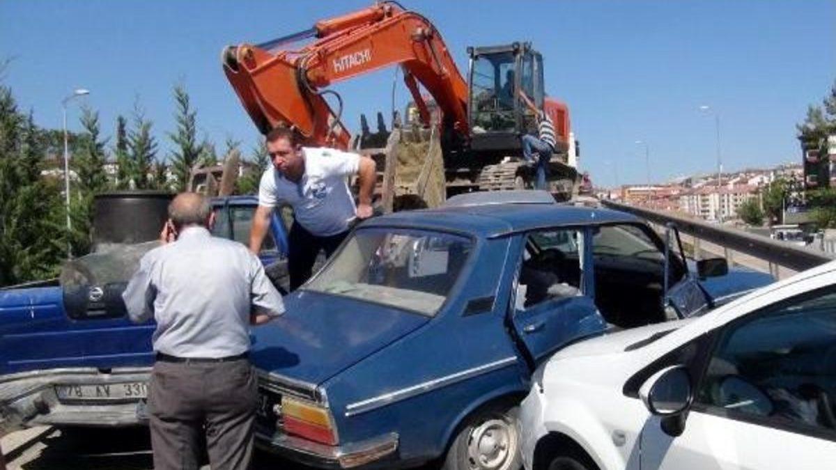 Bülent DİKTEPE/KARABÜK, Kaza, saat 15.00 sıralarında Beşbinevler Mahallesi'ndeki üst geçitte meydana geldi. 50 yaşındaki Sebahattin Akkaya yönetimindeki iş makinesi yüklü 78 BH 560 plakalı TIR, üst geçidi tırmanırken freninin boşalması sonucu geriye kaymaya başladı. TIR, arkasından gelen 1'i kamyonet, 4'ü otomobil 5 araca çarptı. Üst geçidin korkuluklarına takılan TIR, 4 metre yükseklikten alt yola düşmekten kurtuldu. Kazada ölen ve yaralanan olmadı. Araçlarda maddi hasar oluştu. Kaza nedeniyle üst geçit ulaşıma kapandı. Yaklaşık 1 saat süren çalışmayla araçların kaldırılmasından sonra yol ulaşıma açıldı.