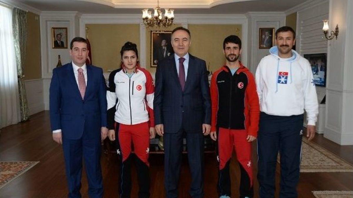 Vali Dr. Ahmet Altıparmak, TCDD Erzurum İşletme Müdürü Yunus Yeşilyurt ile birlikte Kayaklı Biatlon dalında Türkiye, Balkan ve Fis Kupasında derece elde eden milli sporcular Yonca Karademir, Aykut Taşçı ile Demirspor Kayaklı Koşu Milli Takım Antrenörü Mükerrem Yılmaz’ı kabul etti.Demirspor kulübü sporcularının elde ettiği başarıları hakkında Vali Dr. Ahmet Altıparmak’a bilgi veren TCDD Erzurum İşletme Müdürü Yunus Yeşilyurt, birçok dalda olduğu gibi kış sporlarına da ağırlık verdiklerini belirterek, 2015-2016 yılı birinci sezon ulusal ve uluslararası yarışmalarında 8 sporcu ile mücadele ettiklerini söyledi. Yeşilyurt, Vali Dr. Ahmet Altıparmak’ın manevi destekleri sayesinde başarılarının artacağına inandığını söyledi.Kabulde aldıkları başarılardan dolayı Yunus Yeşilyurt , Antrenörü Mükerrem Yılmaz ve Demirsporlu sporcuları tebrik eden Vali Altıparmak, başarılarının devamı dileği ile sporcuları altınla ödüllendirdi.