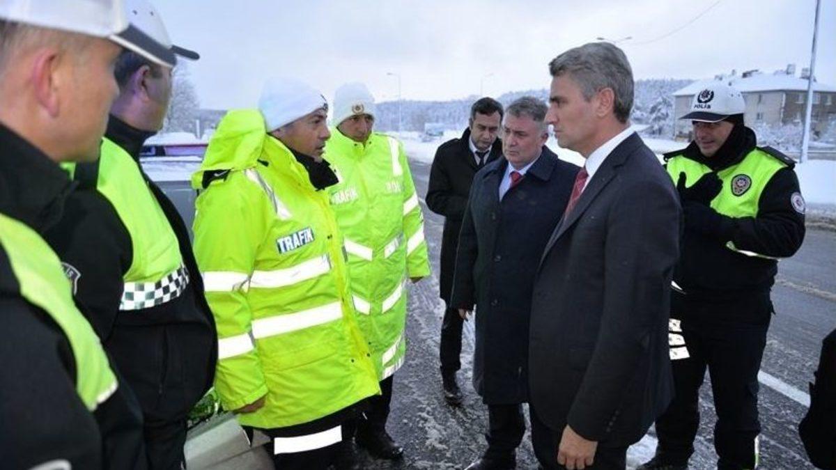 Bolu Valisi Aydın Baruş, Türkiye’nin en önemli geçiş noktaları arasında yer alan Bolu Dağı geçişinin sorunsuz geçilmesi için çalışmalar sürerken, güzergahta görev alan emniyet ekiplerini ziyaret ederek çalışmaları yerinde inceledi.Bolu Valisi Aydın Baruş, İl Emniyet Müdürü Armağan Adnan Erdoğan ile birlikte, Türkiye’nin en önemli geçiş noktaları arasında yer alan Bolu Dağı’na giderek, görev yapan emniyet ekiplerinin çalışmalarını yerinde inceledi.Uygulama noktasını ziyaret eden ve ekiplere işlerinde kolaylıklar dileyen Vali Baruş, alınan önlemler ile ilgili polislerle görüşürken, şimdiye kadar önemli bir olayın olmadığı için de emniyet çalışanlarına teşekkür etti.Zorlu hava koşullarında karla mücadelede çalışan tüm personele teşekkür eden Vali Baruş, “Kış mevsiminde trafikte sorun oluşturan en önemli konu yollara hazırlıksız çıkan araçlar. Özellikle yoğun kar yağışının ve buzlanmanın olduğu zamanlarda tedbirsiz olarak trafiğe çıkan araçları belirli noktalarda durdurarak diğer sürücülerin can ve mal emniyetini tehlikeye atmalarına izin vermememiz gerekiyor. Bunun için de görevli tüm kurumların koordinasyon içerisinde çalışması önem taşıyor. Bu nedenle emniyet birimlerimizin yanı sıra karayolları ekipleri ve Düzce Emniyet birimleri ile de birlikte çalışması başarılı sonuçlar ortaya çıkarıyor ”dedi.Vali Baruş, emniyet ekiplerine tatlı ikramında bulunduktan sonra ayrıldı.