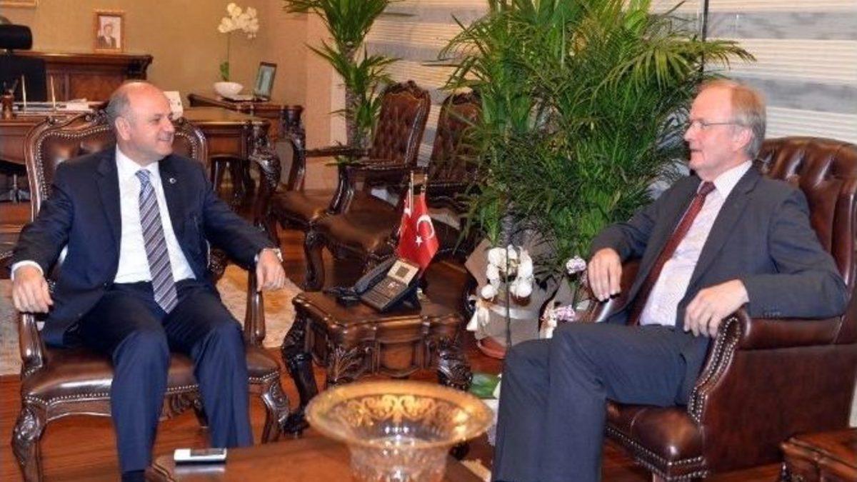 Mersin Valisi Özdemir Çakacak, Almanya Ankara Büyükelçisi Eberhard Pohl’u makamında kabul etti.Mersin Ticaret ve Sanayi Odası tarafından organize edilecek olan Türk-Alman İş Forumu’na katılmak üzere kente gelen Büyükelçi Pohl, Valilik Şeref Defteri’ni imzaladıktan sonra Vali Çakacak ile makamında bir görüşme gerçekleştirdi. Burada konuşan Çakacak, Türkiye ile Almanya arasında tarihten gelen köklü bir geçmiş, yakın dostluk ve önemli ticari ilişkilerin bulunduğunu ifade etti. Hem Mersin özelinde hem de Türkiye genelinde ticaret hacminin en yüksek olduğu ülkenin Almanya olduğunu aktaran Çakacak, “Bu doğrultuda ilimizde gerçekleşecek olan Türk-Alman İş Forumu’nun son derece önemli olduğunu ifade etmek istiyorum. Çünkü Mersin son derece önemli potansiyellere sahip bir kenttir. Mersin’de Türkiye’deki tarımsal üretimin yüzde 5,5’ine tekamül eden bir üretim hacmi var. 9 bin 500 kişinin istihdam edildiği büyük bir serbest bölgemiz var. Yine dünya sanayisiyle entegre olmuş bir organize sanayi bölgemiz ve büyük sanayi tesislerimiz var. 321 kilometrelik eşsiz bir sahil bandımız var. İşlem hacmi olarak Türkiye’nin en büyük 2’inci limanına sahibiz. Bu yüzden böyle bir kapasite ve potansiyele sahip bir şehri, Alman ekonomisinin büyük firmalarının buradaki işletmelerle birlikte toplantı yaparak tanımaları ve keşfetmeleri son derece önemlidir” dedi.Almanya Ankara Büyükelçisi Pohl ise Mersin’de bulunmaktan duyduğu memnuniyeti dile getirerek, iki ülke arasındaki ekonomik ilişkilerin mükemmel bir seviyede olduğunu söyledi. Alman şirketlerin genellikle büyük şehirlerde faaliyet gösterdiğine dikkat çeken Pohl, “Biz, yarın düzenleyeceğimiz iş forumu gibi ekonomi günlerini daha çok Türkiye’nin diğer dinamik bölgelerine yayarak Alman ekonomisinin bu bölgeleri de keşfetmesini amaçlıyoruz. Mersin de bize iyi bir seçim olduğunu gösterdi. Alman tarafındaki ilgililere de bu duyuruyu yaptığımızda yarınki toplantıya büyük bir ilgi göstereceklerini ifade ettiler” diye konuştu.