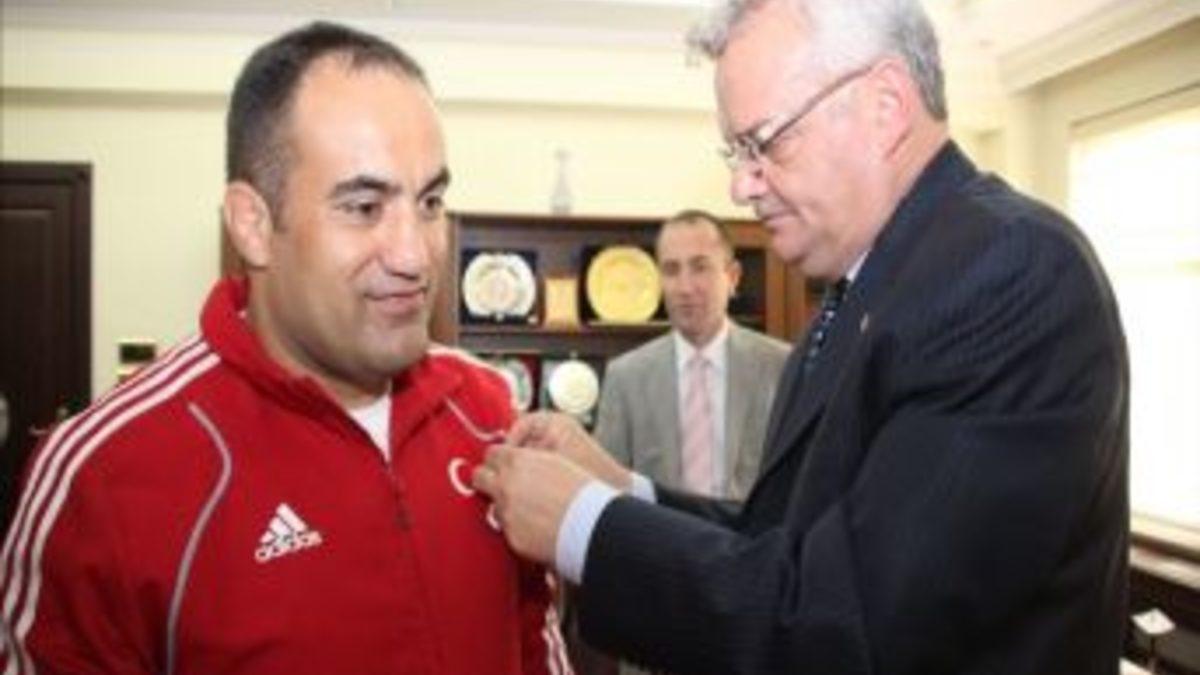 Çankırı Valisi Vahdettin Özcan, dünya ikincisi engelli güreşçi Seyfettin Karadeniz'i altınla ödüllendirdi.