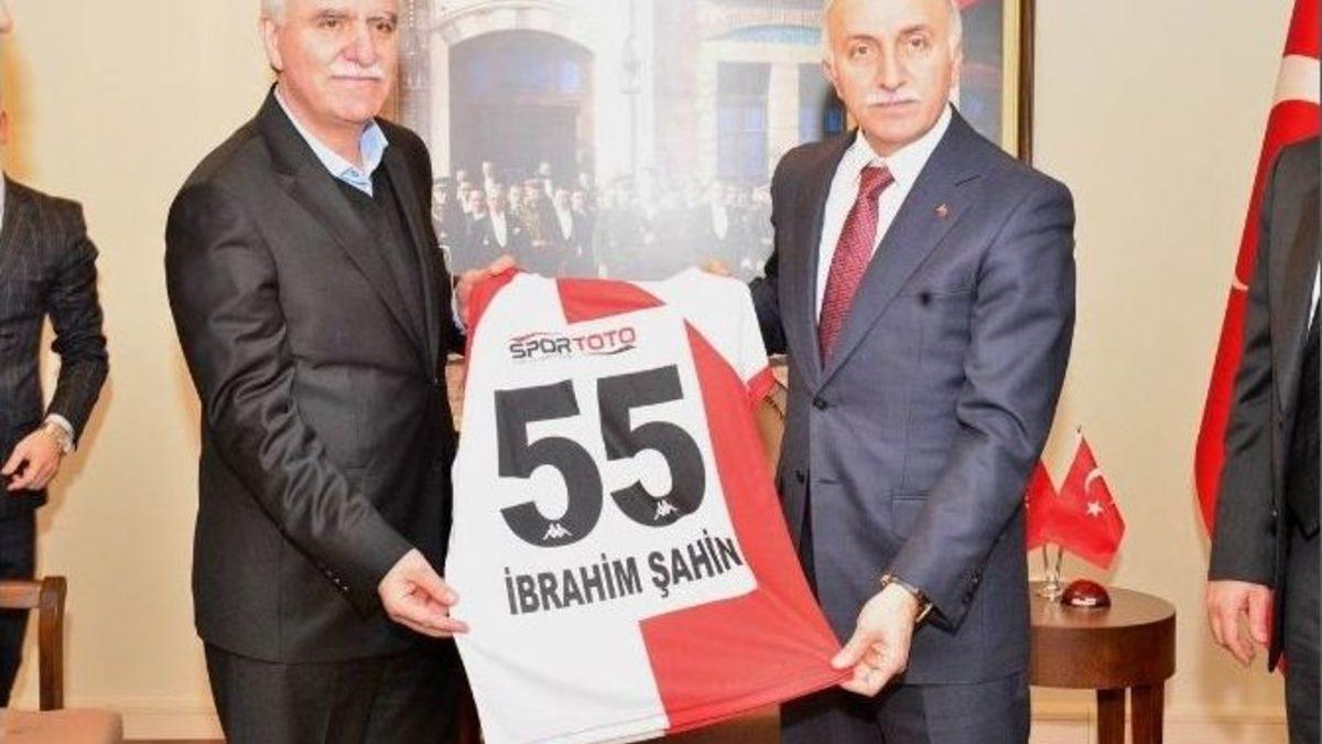 Samsunspor Başkanı Erkurt Tutu ve beraberinde yönetim kurulu üyeleri Vali İbrahim Şahin’i ziyaret ederek forma hediye etti.Samsunspor Başkanı Erkurt Tutu ve beraberinde yönetim kurulu üyeleri Vali İbrahim Şahin’e teşekkür ederek, Samsunspor’un son durumu hakkında bilgi verdi.Ziyaretlerinden dolayı duyduğu memnuniyeti ifade eden Vali Şahin, Samsunspor Başkanı Erkurt Tutu ve yönetim kurulu üyelerine teşekkür ederek, çalışmalarında ve Samsunspor’a başarılar diledi.Piyango bileti aldıDaha sonra Vali Şahin, 51. yıl etkinlikleri kapsamında Samsunspor’a ek gelir sağlamak amacıyla düzenlenen 51. Yıl Milli Piyango bileti satın aldı.Ziyaretin sonunda, Samsunspor Başkanı Erkurt Tutu, Vali’ye 55 numaralı İbrahim Şahin yazılı Samsunspor forması takdim etti.