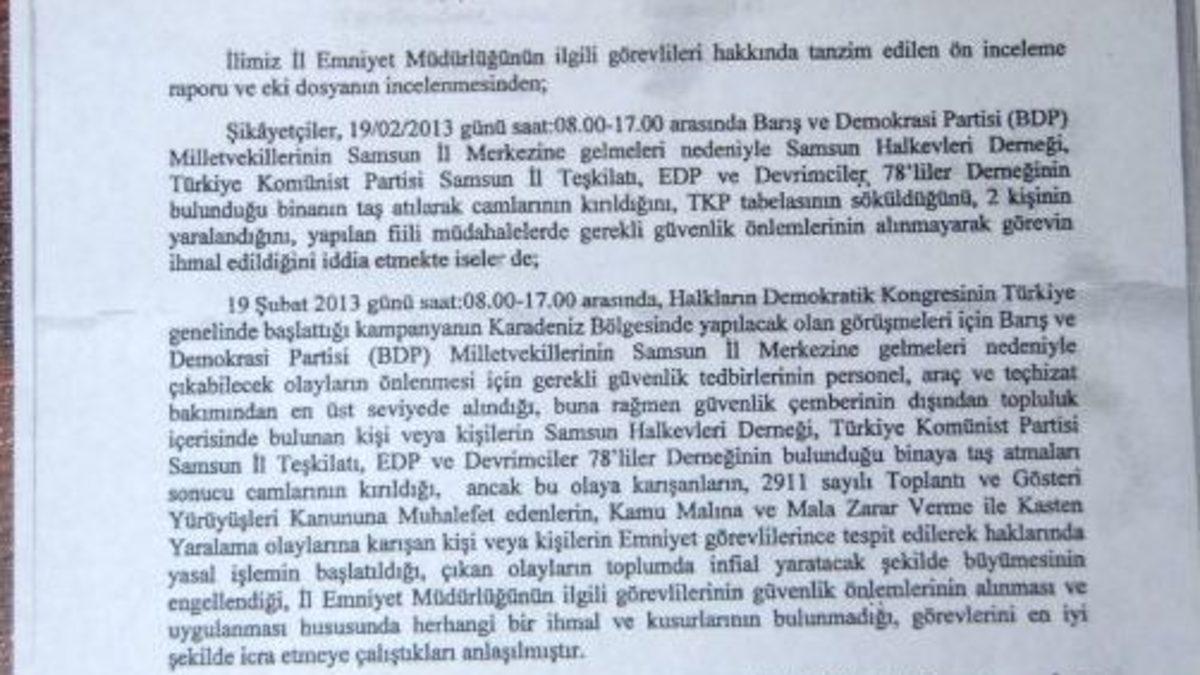BDP’li milletvekillerinin Samsun ziyaretinde Gazi Caddesi’nde çıkan olaylarda mağdur olduklarını belirten kişilerin savcılığa yaptığı suç duyurusu sonrası Samsun Valiliği'nin yaptığı ön inceleme çalışması tamamladı. Hazırlanan raporda, güvenlik güçlerinin ihmali olmadığı gerekçe gösterilerek soruşturma izni verilmeyeceği belirtildi.
