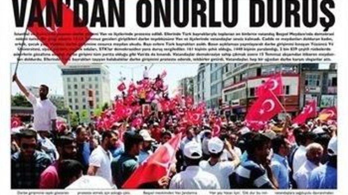Van’da günlük yayın yapan gazeteler, 15 Temmuz darbe girişimine tepkilerine tepkilerini manşetten verdiler.Türkiye’deki darbe girişiminin yankıları sürerken, gazetelerde olayların detaylarını manşetlerine taşıdı. Van’da yayın yapan Bölge Gazetesi ‘Darbelere Hayır!’ manşetiyle okuyucuların karşısına çıkarken, Prestij Gazetesi ’Başbakan Binali Yıldırım’ın ‘Milletimizle Beraber Büyük Bir Belayı Defettik’, Vansesi Gazetesi ‘Van’dan Onurlu Duruş’, Şehrivan Gazetesi ‘Darbeye Van Münit’ başlığını tercih ederken, Van Olay Gazetesi ise ‘Halk Darbeye Dur Dedi’ başlığıyla okuyucusunun karşısına çıktı.