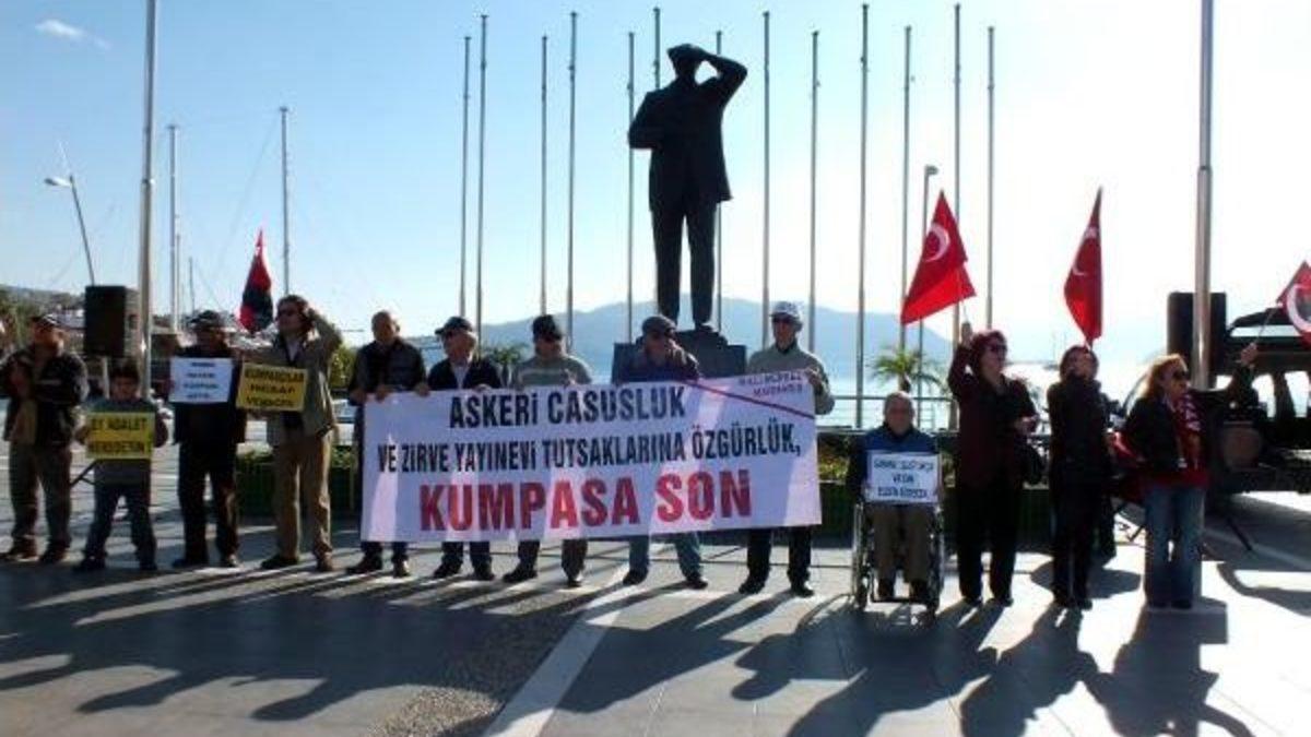 Ali GÜNDOĞAN/MARMARİS İstanbul, Ankara, İzmir, Gölcük, Bursa, Eskişehir ve Antalya ile eş zamanlı olarak düzenlenen eylemde; Kordon Caddesi'ndeki Atatürk Anıtı önünde bugün saat 13.00 sıralarında bir araya gelen Vardiya Bizde Platformu, 'Sessiz çığlık' adını verdikleri eylemlerine yenisini ekledi. Grup, Milli Güvenlik Kurulu toplantısının yapıldığı salonda Atatürk fotoğrafı olmaması da protesto etti. Topluluk, 'Askeri casusluk ve Zirve Yayınevi tutsaklarına özgürlük, kumpasa son' yazılı dev pankartın arkasına geçti. Grupta tekerlekli sandalyedeki bir gazi 'susma, sustukça vatan elden gidecek' yazılı döviz taşıdı. Asker yakını kadın ve çocuklar da elinde 'Hak, hukuk, adalet', 'ey adalet neredesin', 'direne direne kazanacağız' ve 'kumpasçılar hesap verecek' yazılı dövizler taşıdı. Türk bayrakları da sallayan grubun eylemi 10'uncu Yıl Marşı eşliğinde başladı.