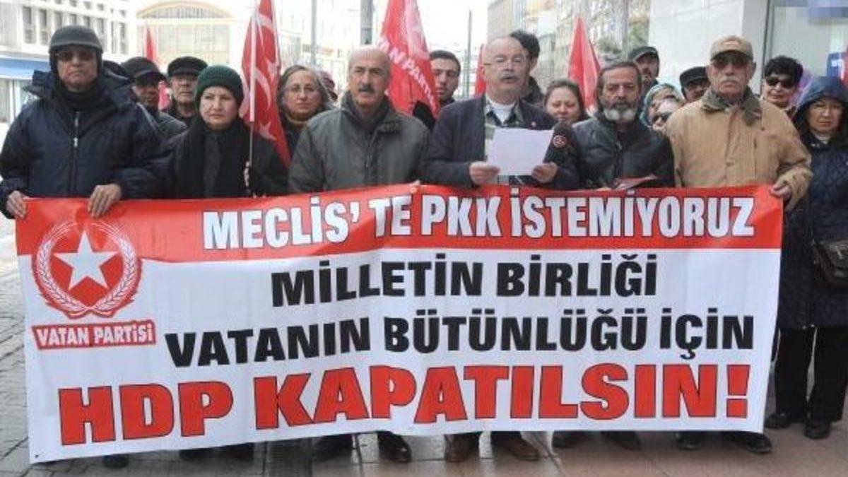 Eyüp KELEBEK/ESKİŞEHİR, İsmet İnönü Caddesi'nde toplanan ve aralarında Vatan Partisi İl Başkanı Raif Eşkinat'ın da bulunduğu yaklaşık 30 kişi 'Meclis'te PKK istemiyoruz. Milletin birliği, vatanın bütünlüğü için HDP kapatılsın' yazılı pankart açtı. İl Başkanı Raif Eşkinat yaptığı konuşmada HDP'nin PKK ile iç içe geçtiğini öne sürerek şunları söyledi: