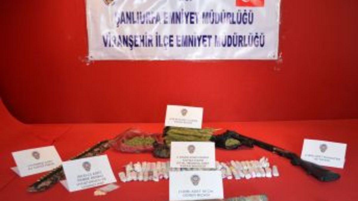Şanlıurfa'nın Viranşehir ilçesinde 2 gram esrar maddesi, 250 gram esrar bitkisi, 50 adet uyarıcı hap, 1 adet ruhsatsız av tüfeği, 15 adet av tüfeği fişeği ve 1 adet 60 santimetre uzunluğunda döner bıçağı ele geçirildi.