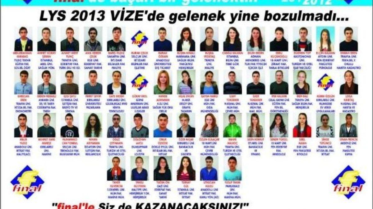 Kırklareli'nin Vize İlçesi’nde Final Dergisi Dershanesi Öğrencileri, 2013 yılı YGS/LYS ve SBS Yerleştirme Sonuçlarına göre büyük başarı elde etti.Vize Final Dergisi Dershanesi Şube Müdürü Recep Kaya, “ Trakya’da çok büyük başarı elde ettiklerini, öğrencilerinin büyük bir kısmının istediği okullara rahatça girebildiklerini” söyledi.YGS ve LYS’de Vize olarak güzel başarılar elde ettiklerini dile getiren Kaya, “ 8.Sınıf SBS yerleştirme sonuçlarına göre; 3’ü Tekirdağ, 3’ü Edirne olmak üzere toplam 6 öğrencimiz Fen Liselerine, 6 öğrencimiz Anadolu Öğretmen Liselerine, 59 öğrencimiz Anadolu Liselerine, 8 Öğrencimiz Anadolu Sağlık Meslek Liselerine, 6 Öğrencimiz Anadolu Teknik ve Endüstri Meslek Liselerine, 1 Öğrencimiz Anadolu Ticaret Meslek Lisesine, 2 Öğrencimiz Anadolu Kız Teknik ve Meslek Lisesine ve 3 Öğrencimiz Anadolu Otelcilik ve Turizm Meslek Liselerine olmak üzere toplam 91 Öğrencimizi istedikleri okullara yerleştirdik. Dershanemizin bu yılki SBS yerleştirme oranı %98 gibi gurur verici bir rakama ulaşmış bulunmaktadır”Üniversitelere yerleştirme sayı ve oranlarına bakıldığında da durumun farklı olmadığını belirten Recep Kaya, sözlerini şöyle devam etti,”2013 yılında yapılan YGS/LYS sınavlarının sonuçlarına göre üniversite tercihi yapan 59 öğrencimizden 37’si çeşitli Lisans programlarına 14’ü ise Önlisans programlarına olmak üzere toplam 51 öğrencimizi %87 gibi bir oranla Üniversitelere yerleştirmenin mutluluğunu yaşıyoruz. Öğrencilerimizin gösterdikleri üstün başarılardan dolayı öncelikle kendilerini, anne ve babalarını, okul yönetimleri ile okul öğretmenlerini ve tabiî ki 9. yılımızı doldurduğumuz Vize’de tüm zamanlarını ve enerjilerini büyük bir özveri ile öğrencilerimizin başarıları için harcayan öğretmen kadromuza ve personelimize çok teşekkür ediyorum” dedi.