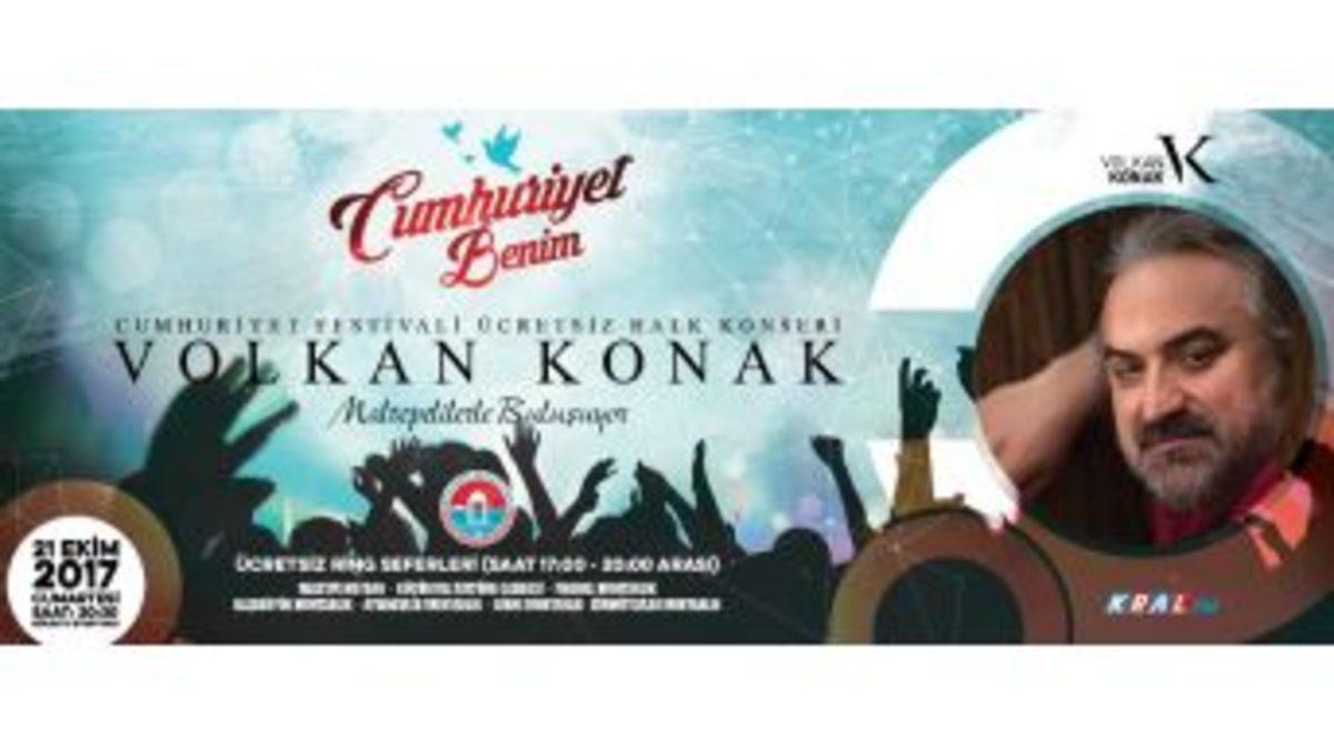 Türkiye’de bir ilke imza atarak Cumhuriyetin 94’üncü yılını 94 etkinlikle kutlayan Maltepe Belediyesi, festival kapsamında ünlü sanatçı Volkan Konak’ı Maltepelilerle buluşturuyor. Konser günü ilçenin 6 farklı noktasından ring seferleri düzenleyecek olan belediye, vatandaşları konser alanına ücretsiz taşıyacak.Maltepe Belediyesi tarafından gerçekleştirilen Cumhuriyet Benim Festivali’nin 21 Ekim cumartesi günkü konuğu, ünlü sanatçı Volkan Konak olacak. Sevilen şarkılarını Maltepeliler için söyleyecek Konak’ın ücretsiz halk konseri, saat 20.30’da Maltepe Gülsuyu Stadyumu’nda gerçekleştirilecek.Ücretsiz ring seferleriKonser hazırlıklarını sürdüren Maltepe Belediyesi, ilçenin belli noktalarından konser alanına ücretsiz ring seferleri yapacağını duyurdu. 21 Ekim Cumartesi günü saat 17.00’da başlayacak ücretsiz ring seferleri, saat 20.00’a kadar devam edecek. Maltepe’nin 7 farklı noktasından vatandaşları konsere taşıyacak servislerin hareket noktası ise şöyle: Maltepe Meydanı, Küçükyalı Mahallesi Atatürk Caddesi, Fındıklı Mahallesi muhtarlık yanı, Başıbüyük Mahallesi muhtarlık yanı, Aydınevler Mahallesi muhtarlık yanı, Girne Mahallesi muhtarlık yanı, Zümrütevler Mahallesi muhtarlık yanı.