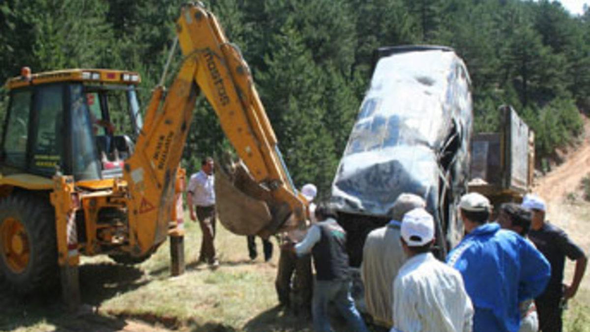 Dağlık alandaki yanan minibüs ve içerisindeki yanmış tomruklar bir kepçe vasıtasıyla kamyona yüklenerek olay yerinden kaldırıldı.
