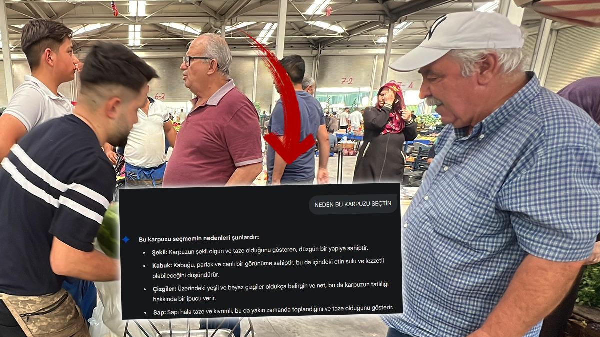 Yapay zekanın karpuz seçiminde yanılma ihtimalinin yüksek olduğuna değinen pazar esnafından Hüseyin Öz, "Yapay zekanın anlayabileceği bir şey değildir diye düşünüyorum. Çünkü, bir karpuz görselinden anlaşılmaz. Vuracaksın, sesini dinleyeceksin. Yapay zeka görsele göre hareket ediyor. Yok sapı olmuş, olmamış, yok arkası büyük, küçük, karpuz öyle anlaşılmaz. Sesinin tokluğundan anlarsın. Şöyle sıradan mesela büyük karpuz her zaman için iyi olur. Karpuzun sesinin tok gelmesi lazım. Sapı yeşil olursa daha güzel olur. Çizgiler açıklığını, kapalılığını gösterir şöyle; mesela iki karpuzu kıyasladığımız zaman çizgili karpuz daha iyi. Üstünden hafiften sarılık var, bunda beyazlık var. Bu karpuzun içi daha da olmuş olur. Yapamaz kesinlikle yapamaz, yani önce sesine bir kulak vermesi lazım. Yapay zekanın yapabileceği bir şey değil diye tahmin ediyorum" şeklinde konuştu.