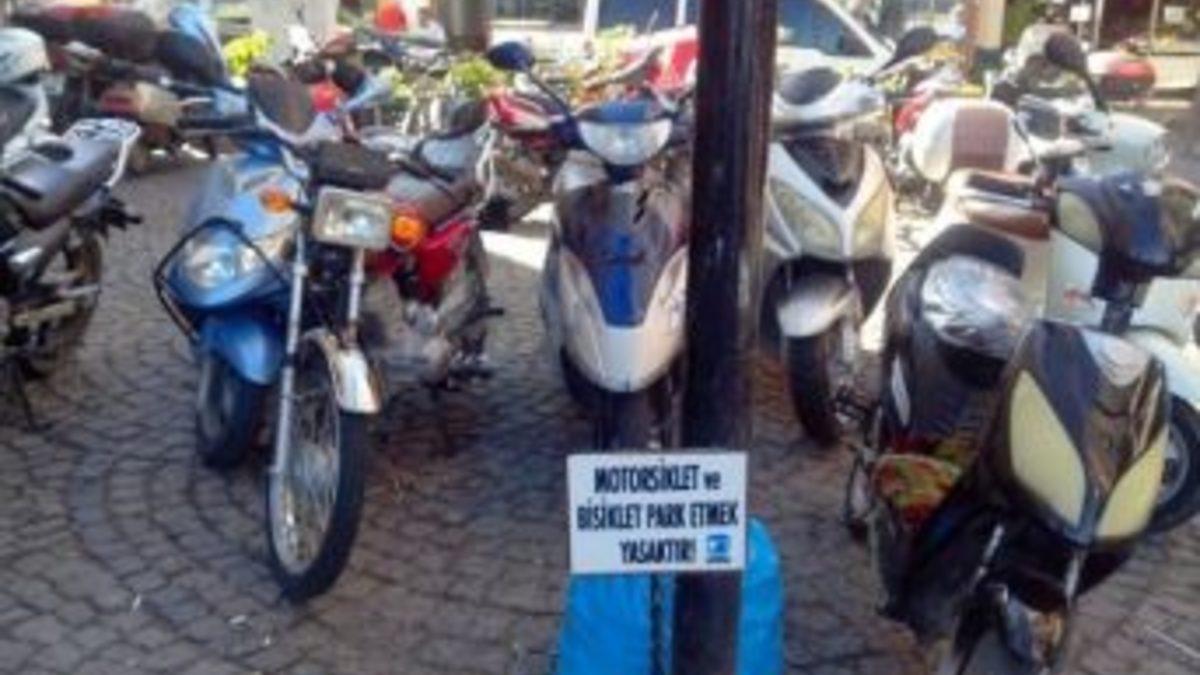 Çanakkale’de, motosiklet ve bisiklet park edilmesinin yasak olduğu tabelayla belirtilen bir alan, motosikletlerden geçilmiyor.Çanakkale’de, Yalı Caddesi üzerindeki bir alan, yaya geçişlerinin sağlanması için parklardan arındırıldı. Banklarla süslenen alana belediye tarafından “Motosiklet ve bisiklet park etmek yasaktır” tabelası konuldu ancak bu uyarı bir işe yaramadı. Motosiklet sahiplerinin, tabelanın yazılı olduğu demire bile motosiklet kilitlemesi, ilginç bir görüntü oluşturdu.