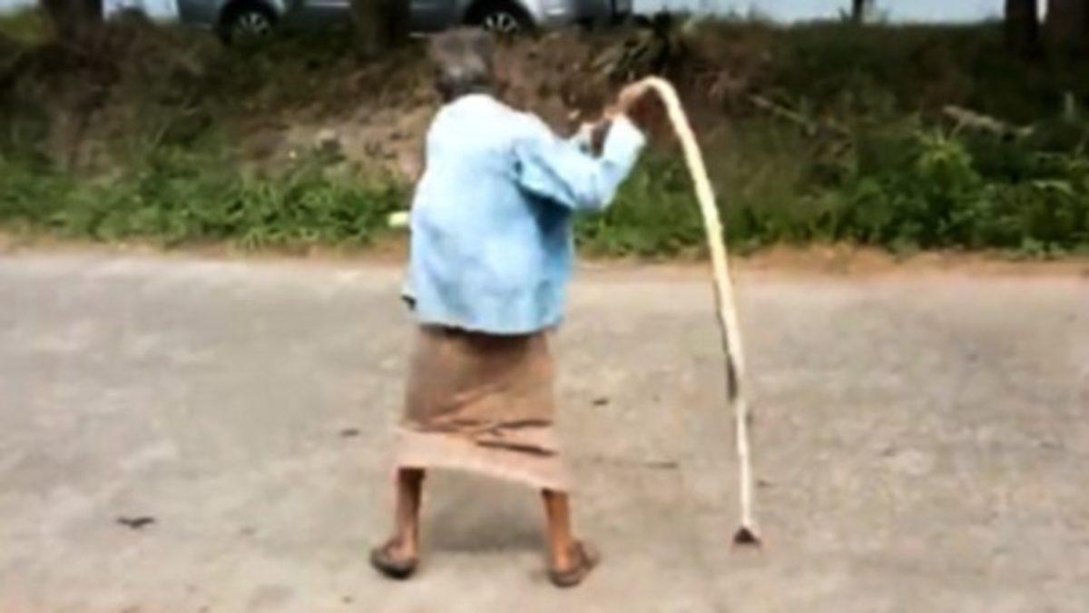 Tayland'da çekildiği belirtilen görüntüde yaşlı bir kadın, evine giren yılanı böyle öldürüyor. Hayli öfkeli olan yaşlı kadın yılanı yerden yere vurarak etkisiz hale getirdiği video sosyal medyada paylaşıldı.