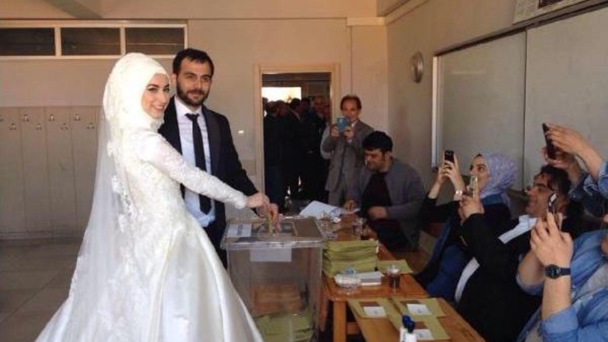 Kocaeli'nin Darıca İlçesi'nde bugün evlenecek olan 28 yaşındaki Metin Saral ile 25 yaşındaki Feyza Alkaya, düğünden önce sandığa giderek oy kullandı. Darıca Abdi İpekçi Mahallesi'nde bulunan 60. Yıl Ortaokulu'na gelin ve damatlıkları ile gelen Metin Saral ile Feyza Alkaya oylarını kullandı. Sandık kurulunda görevli olan ve oy kullanmak için sırada bekleyenler cep telefonları ile gelin ve damadı oy kullanırken fotoğrafladı. Metin Saral ve Feyza Alkaya oylarını kullandıktan sonra okuldan ayrıldı.