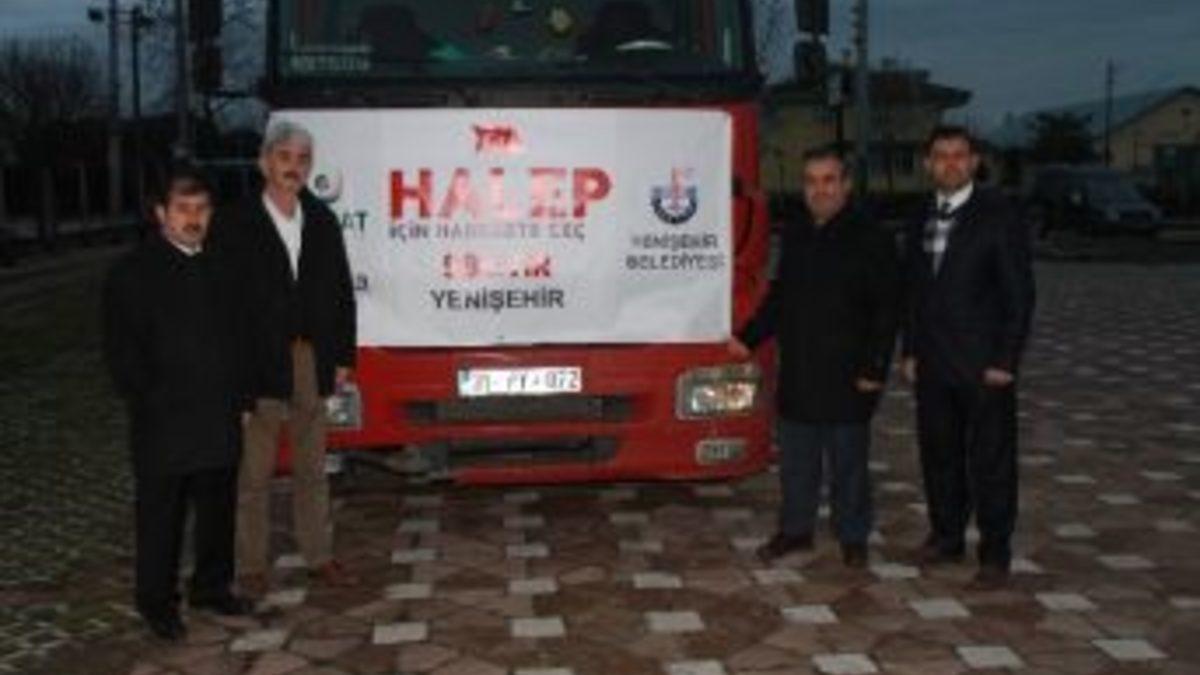 Bursa’nın Yenişehir ilçesinde Halep’e yardım TIR’ı gönderildi.Yenişehir Belediyesi öncülüğünde Halep için yardım toplandı. Belediyespor Sosyal Tesisleri’nden yola çıkan yardım TIR’ında gıda ağırlıklı olmak üzere soba, kıyafet, yakacak, elektrikli fırınlar bulunuyor. Toplam 27 tonluk yardımla doldurulan TIR’ı Belediye Başkan Yardımcısı Zekai Dündar, AK Parti İlçe Başkanı Adnan Kamıl ve yönetim kurulu üyeleriyle Yenişehir Belediyesi Kültür ve Sosyal İşler Müdürü Ramazan Ceyhan Oruç yolcu etti.Zekai Dündar, Halep’de yaşanan insanlık dramına sessiz kalmadıklarını belirterek, “Gerek belediye, gerekse hayırsever işadamlarımızın katkıları ile topladığımız yardımları vakit geçirmeden Halep’e gönderiyoruz. Oradaki insanlara bir nebze katkımız olursa bize yeter. İnşallah yardımlarımızı artırarak devam ettireceğiz” diye konuştu.