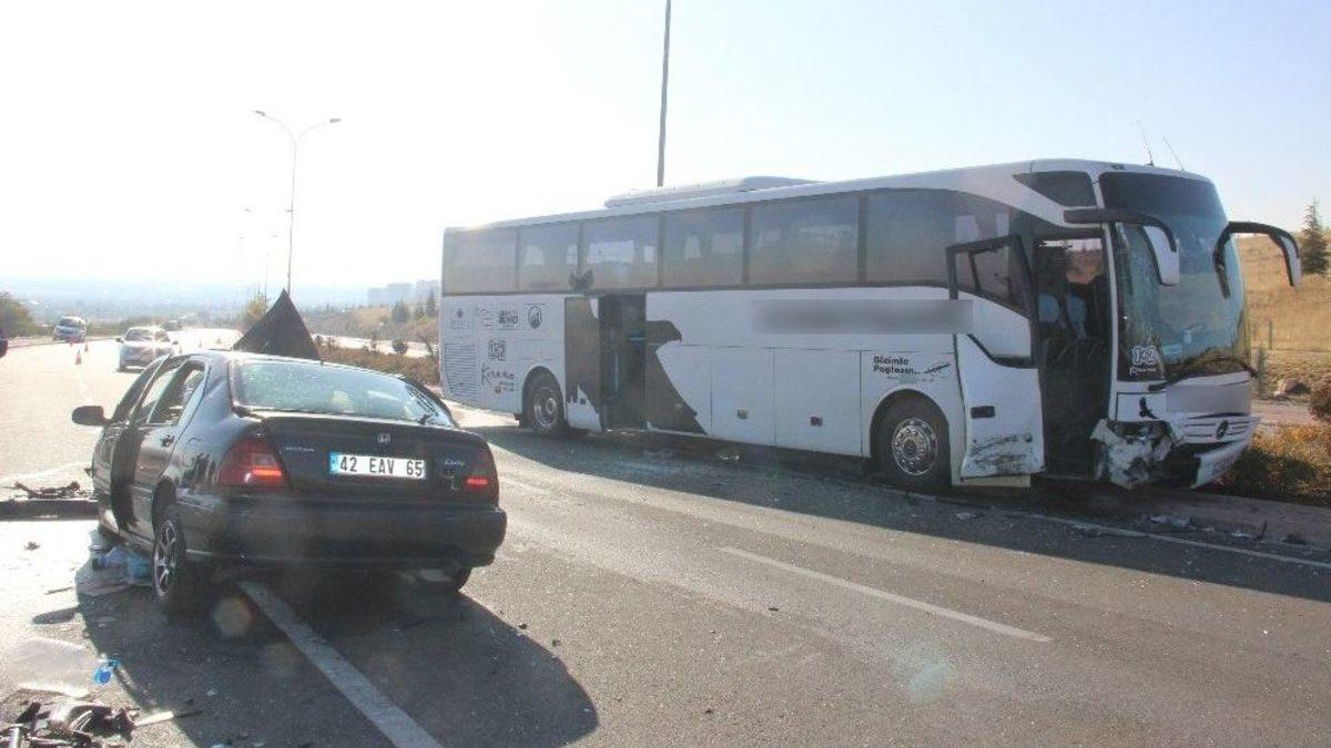 Konya’da yolcu otobüsünün ters istikametten gelen otomobille çarpışması sonucu meydana gelen trafik kazasında 1’i ağır 2 kişi yaralandı.Kaza, saat 09.00 sıralarında, Antalya Çevre Yolu Caddesi ile Dutlukır Cadde Kavşağında meydana geldi. Alınan bilgiye göre, Konya’dan İzmir istikametine seyir halinde olan Kamil T. idaresindeki 42 AOD 37 plakalı şehirler arası yolcu otobüsü, ters yönden giden Muhamer Ö. idaresindeki 42 EAV 65 plakalı otomobil ile kafa kafaya çarpıştı. Çarpışma sonucu hurdaya dönen otomobilde bulunan Muhammer Ö. ile Mine Ö. yaralandı. Otobüs sürücüsü Kamil T.’nin ihbarı üzerine olay yerine polis ve 112 Acil Sağlık ekipleri sevk edildi. Yaralılar ambulanslarla Necmettin Erbakan Üniversitesi Meram Tıp Fakültesi Hastanesine kaldırılarak tedavi altına alındı. Yaralılardan Mine Ö.’nün hayati tehlikesinin bulunduğu öğrenildi. Kazanı ardından otobüste bulunan yolcular başka bir otobüse alınarak, yollarına devam etti.Kazayla ilgili soruşturma başlatıldı.