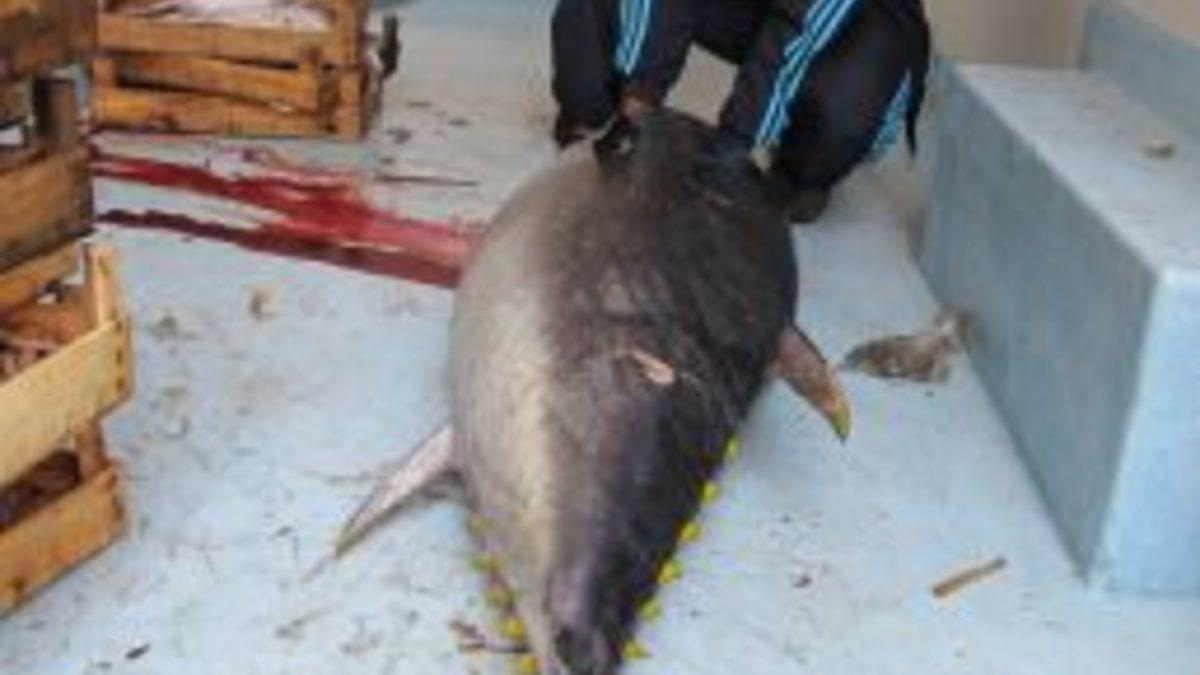Balıkesir'in Edremit ilçesinde Kartal Balıkçılık'tan Cavit Kartal, Çanakkale'nin Ayvacık ilçesinin Küçükkuyu beldesi açıklarında balık avına çıktı. Ağlarına takılan yolunu şaşırmış 110 kiloluk dev orkinosu gören Kartal ve arkadaşları, tekneye çekerek, Edremit'e getirdi.