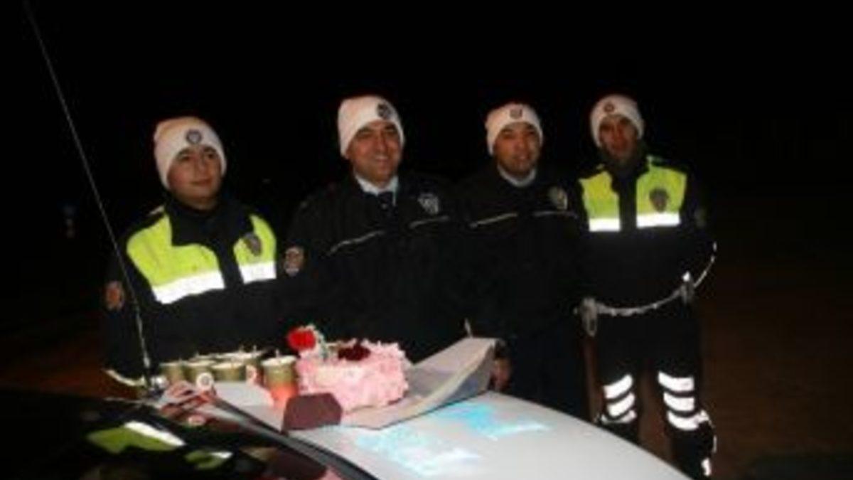 Yozgat’ta yılbaşı gecesinde görevli olan ve yollarda alkol denetimi yapan bölge trafik polisleri, yeni yıla amirleri tarafından getirilen yaş pastayı keserek girdi.Yılbaşında vatandaşların büyük bir kısmı eğlenerek ya da evlerinde yılbaşına girerken, trafik polisleri yollarda denetim yaparak yeni yıla girdi. Yozgat Emniyet Müdürlüğü Böle Trafik Şube Müdürlüğü ekipleri şehirler arası yollarda alkol denetimi yaparken, Bölge Trafik Müdür Vekili Süleyman Tuğrul, görev başındaki personeli ziyaret edip yaş pasta getirdi. Trafik polisleri yeni yıla yaş pasta keserek girdi.Bölge Trafik Müdür Vekili Süleyman Tuğrul, “Polis, halkın, huzurlu, mutluluk içerisinde sağlıklı bir şekilde seyahat etmeleri, trafik güvenliğini sağlamak için çalışıyor. Arkadaşlarımız gecenin bu saatinde alkol denetimi yapıyorlar. Yılbaşı dolayısıyla alkol denetiminin çok olacağını düşünerek, bu gece alkol denetimlerine ağırlık verdik. Jandarma timleri de asayiş yönünden denetim yapıyor. Arkadaşlarımıza jest olsun diye yaş pasta ikram ettik” dedi.Trafik polisleri yılbaşı gecesinde alkol denetimi yaparken, jandarma ekipleri de asayiş yönünden kimlik kontrolü yaptı.