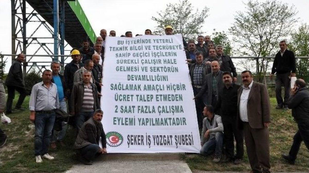Ülke genelindeki şeker fabrikalarında görev yapan geçici işçilerin kadroya alınmaları ve şeker sektörünün sorunlarının çözümü amacıyla, Türkiye Gıda ve Şeker Sanayi işçileri Sendikası (Şeker-İş) Genel Merkezi tarafından alınan 2 saat fazla çalışma eylemine, Yozgat Şeker Fabrikası’nda çalışan işçiler de katılarak, eyleme destek verdi.Yozgat Şeker Fabrikasında bir araya gelen şeker işçileri, hazırladıkları dev afişin altında toplanarak, 2 saatlik fazla çalışma eylemini başlattı. Bir ay boyunca devam edecek olan 2 saatlik fazla çalışma eylemi nedeniyle işçiler fazla ücret talep etmezken, bütün işçiler eyleme destek verdi.Şeker İş Sendikası Yozgat Şube Başkanı Turgut Gözübüyük, eylem sonrası yaptığı basın açıklamasında, 2 saat fazla mesai eyleminin öncelikli hedefinin Şeker İş camiası içerisinde çalışan muvakkat statülü işçilerin kadrolu hale getirilerek üretim bandındaki kalifiye eleman zaafını gidermek, bu zaaftan kaynaklanan ham madde ve zaman israfının da önüne geçmek olduğunu söyledi. Gözübüyük, “Yaptığımız eylemin mesajına bakıldığı zaman (2 Saat fazla mesai) toplumsal fayda ve barışa yöneliktir. İşçi kimliğinin herhangi bir ideoloji ya da siyaset kurumu tarafından manipüle edilmemesi ve bu kimlik üzerinden farklı tartışmalara yol açmaması bu anlamda bir eylemi yerinde bulduk. Öncelikli olarak şeker camiasında muvakkat ve kadrolu işçi kimliğinde farklılaşan ekonomik hüviyeti aynılaştırarak camia içerisinde barışı sağlamak ve bu barışı toplumsal alana yansıtmak, bu yönüyle muvakkat işçilerin ekonomik kimliği üzerinden kendini ötekileştirmesinin önüne geçerken farklı ideolojiler tarafından manipüle edilmesine engel olmaktır” dedi.Gözübüyük, muvakkatların kadroya alınmasıyla beraber nitelikli eleman zaafın giderileceği, muvakkat ile kadrolular arasında kimlik farklılığını ortadan kalkacağını sözlerine ekledi.İşçilerden Mustafa Halıcı, muvakkat işçi olduklarını burada öğrendiklerini belirterek, “Yılda 5-6 ay farklı sürelerde çalıştırılıp işten çıkartılıyoruz. Yerimize taşeron işçi adı altında personel alınıyor. Bizlerin bu şekilde çalışarak emekli olması ihtimali bulunmuyor. Bizler mezarda emekli olmak istemiyoruz” diye konuştu.
