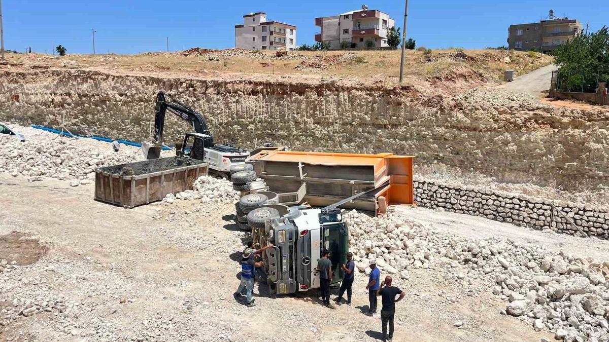 Adıyaman’ın Besni ilçesinde yük boşaltma sırasında kontrolden çıkan kamyon devrildi.