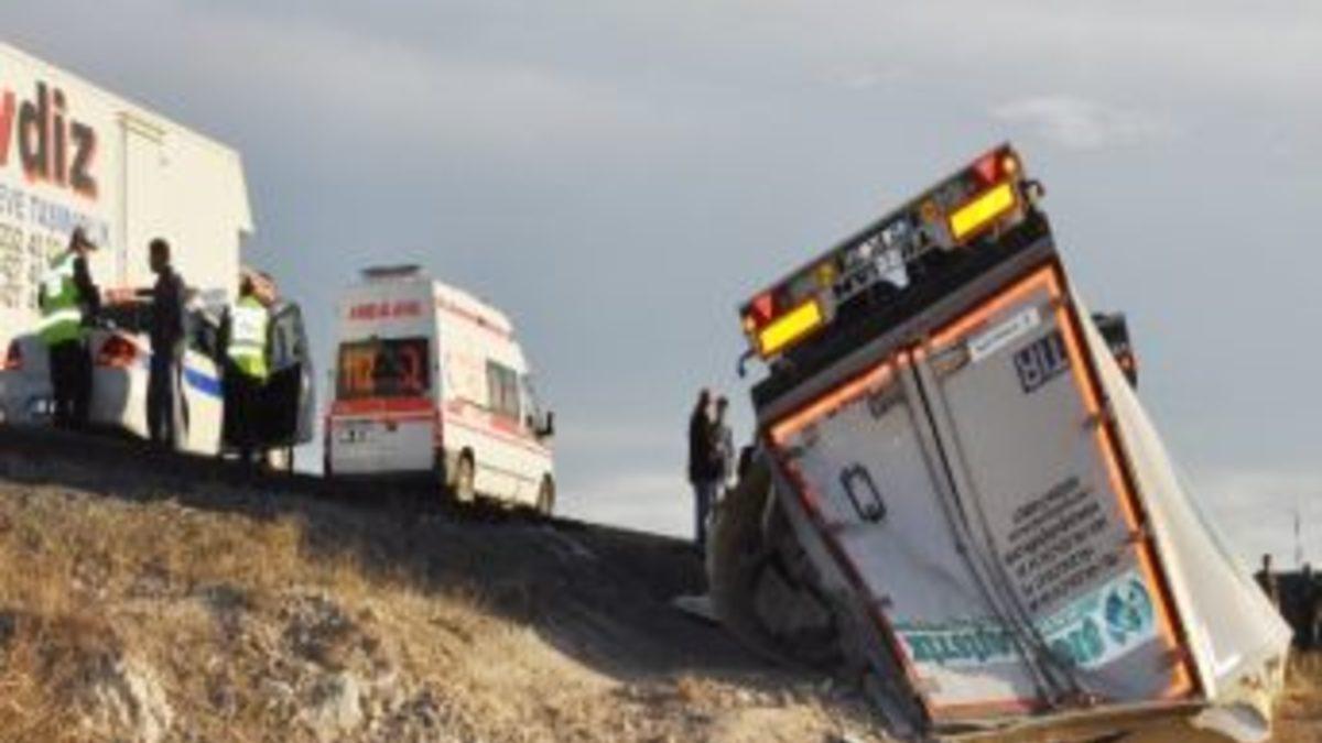 Aksaray'da, sürücüsünün direksiyon hakimiyetini kaybetmesi sonucu yumurta yüklü TIR devrildi.