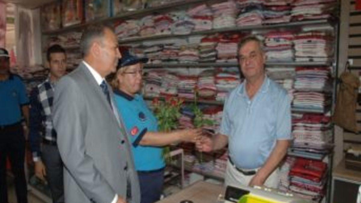 Büyükşehir Belediyesi Zabıta Daire Başkanı Tarık Öncel ve ekibi, Atatürk Anıtı’na çelenk koyup saygı duruşunda bulunduktan sonra vatandaşlara ve esnafa çiçek verdiler.